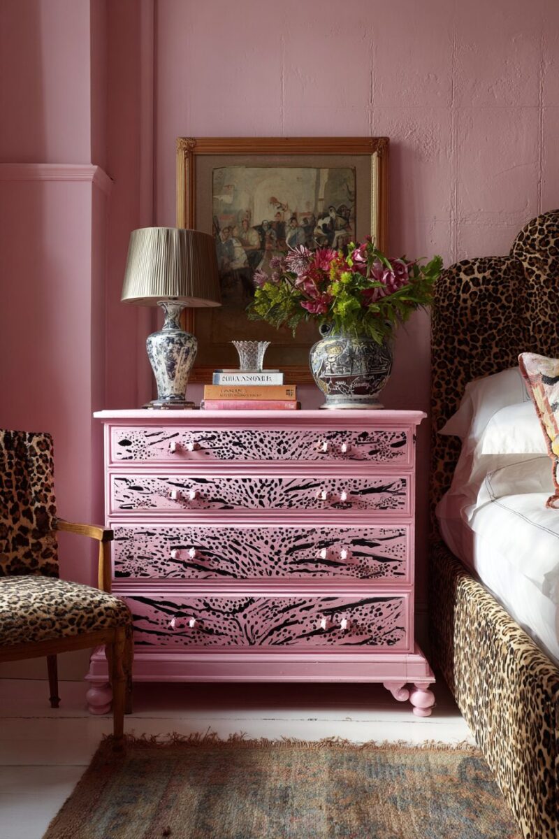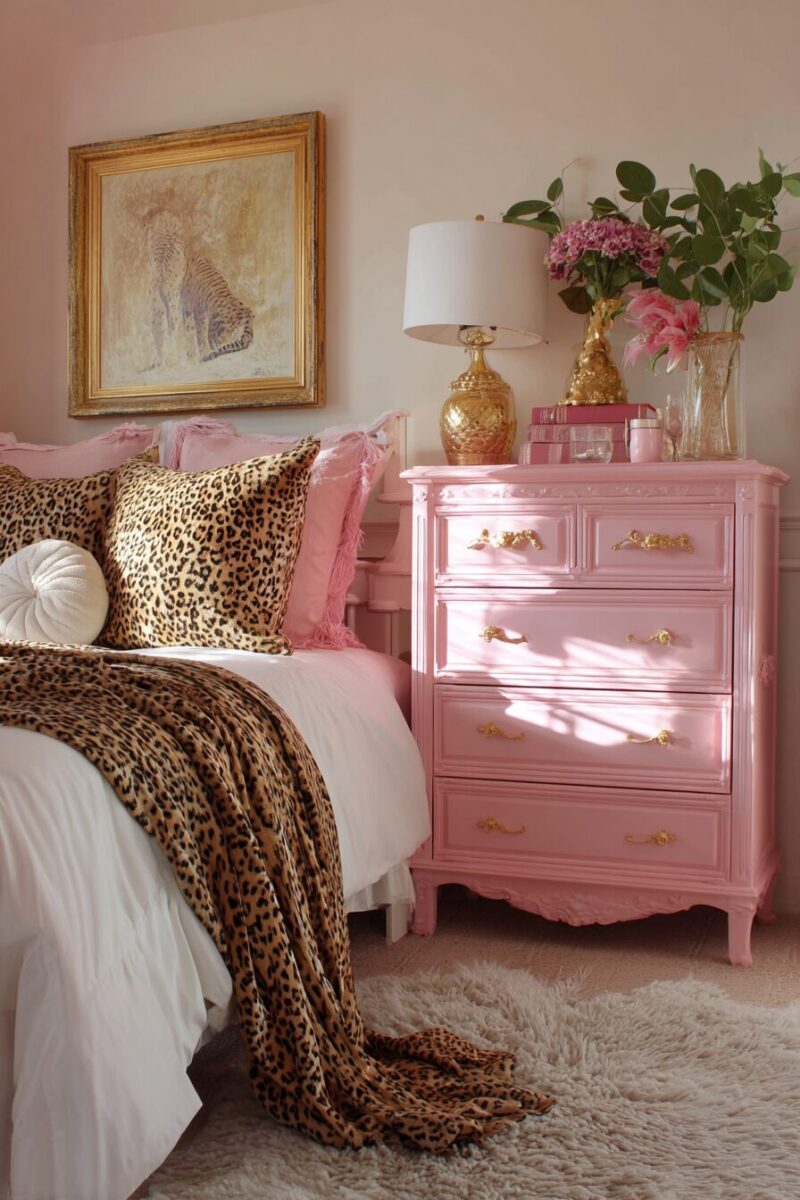 Add cheetah print accents through drawer pulls, cabinet knobs, lamp finials, or small decorative objects placed on your newly pink furniture.