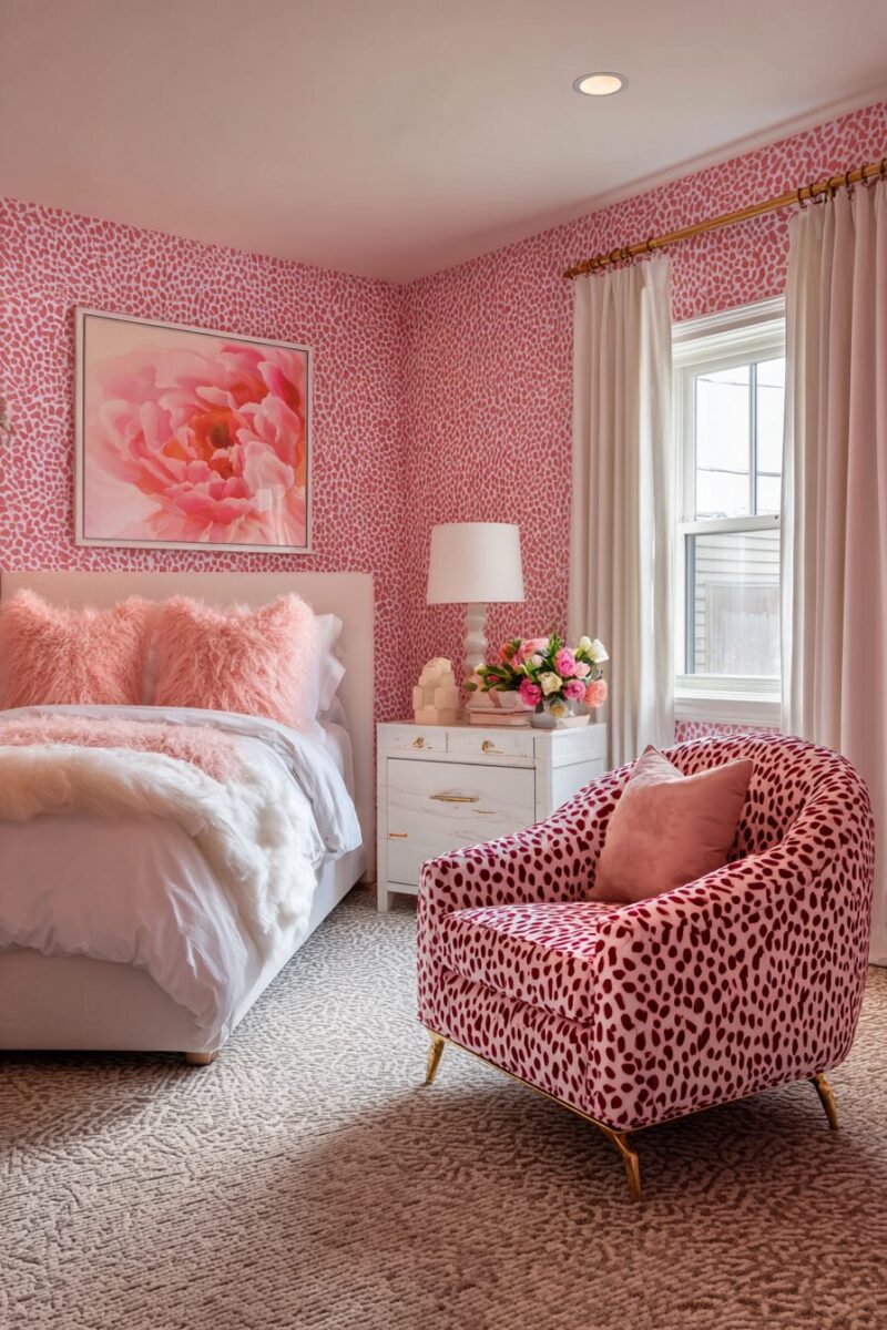 Choose pink wallpaper with subtle texture or pattern – perhaps a grasscloth texture, delicate floral motif, or geometric design that adds interest without competing with your cheetah furniture.