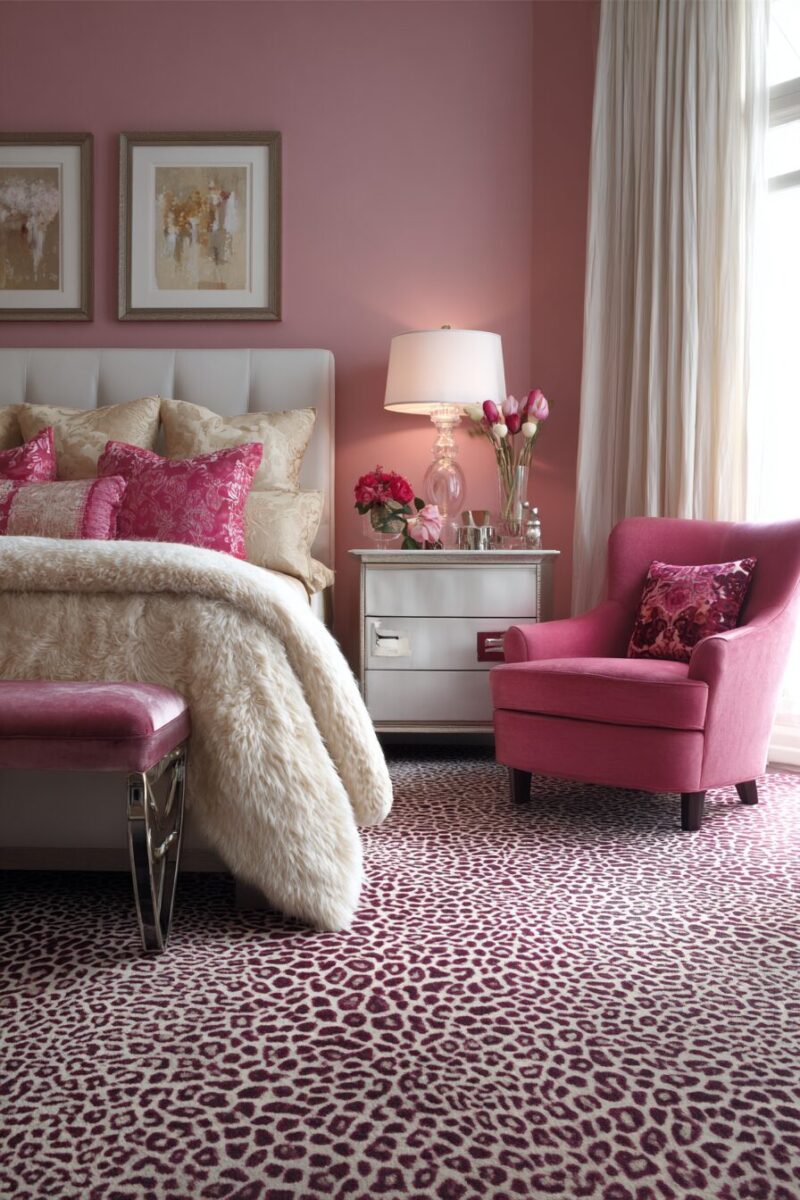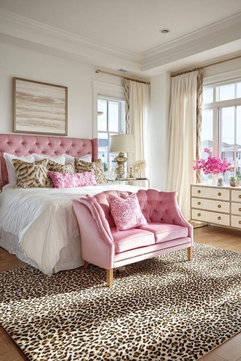 Ground your bedroom design with a luxurious cheetah print area rug that serves as the foundation for incorporating pink furniture pieces throughout the space.