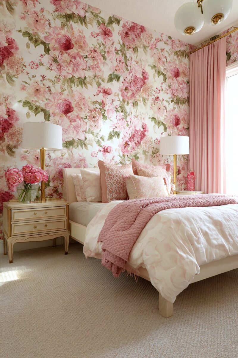 Large-scale floral patterns work beautifully as accent walls, while smaller, more delicate patterns can cover entire rooms without feeling too busy or claustrophobic.