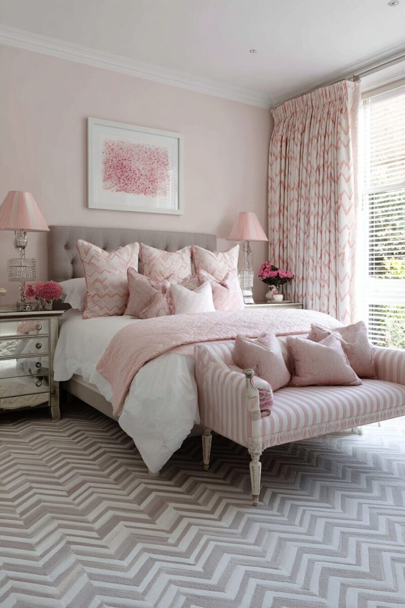 Geometric patterns in pink and white bring modern sophistication to your bedroom while creating visual interest that’s both bold and balanced at the same time.