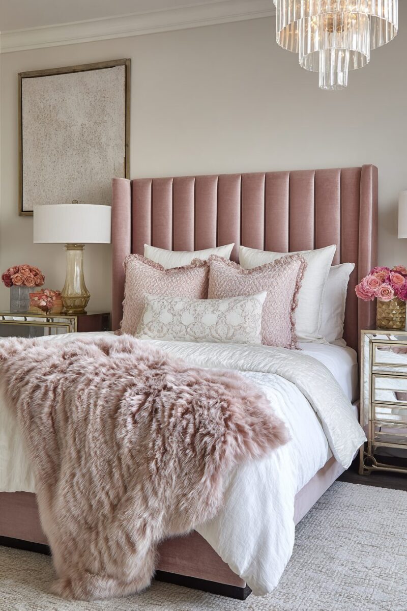 Metallic accents in gold, brass, or rose gold complement pink velvet beautifully and add an extra layer of luxury to your bedroom design.