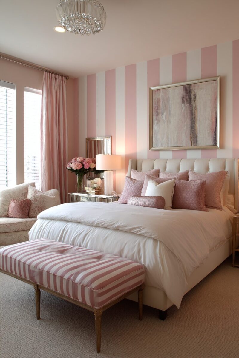 White walls will make your striped bedding the star of the show, while pink walls can create a more monochromatic, layered look.