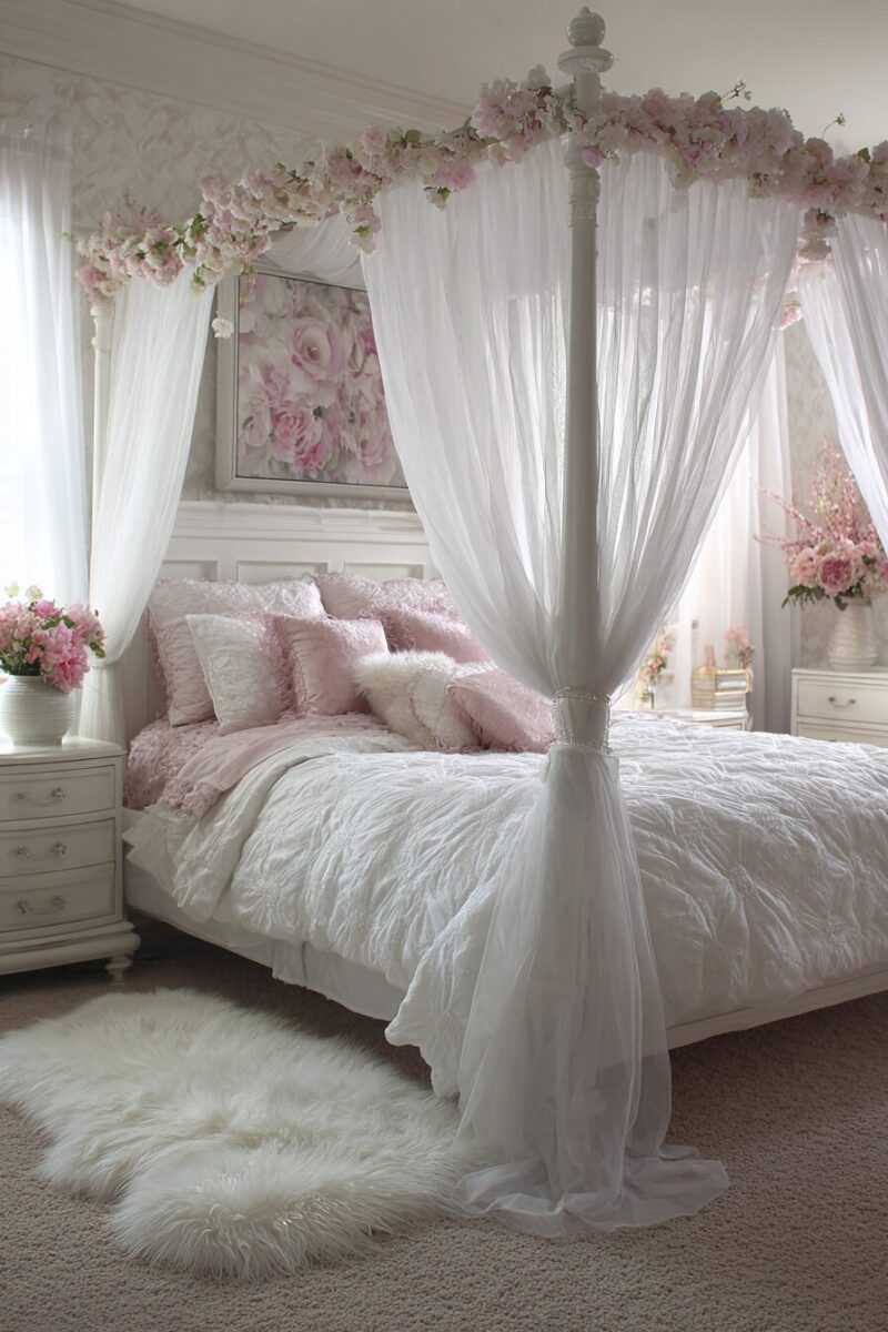 A white canopy bed draped with flowing pink curtains will transform your bedroom into the romantic retreat you’ve always dreamed of having.