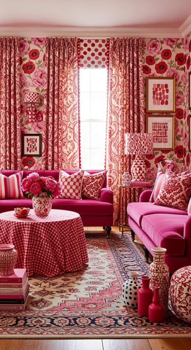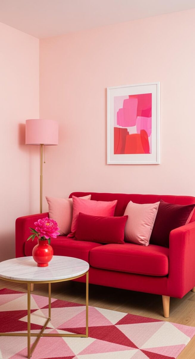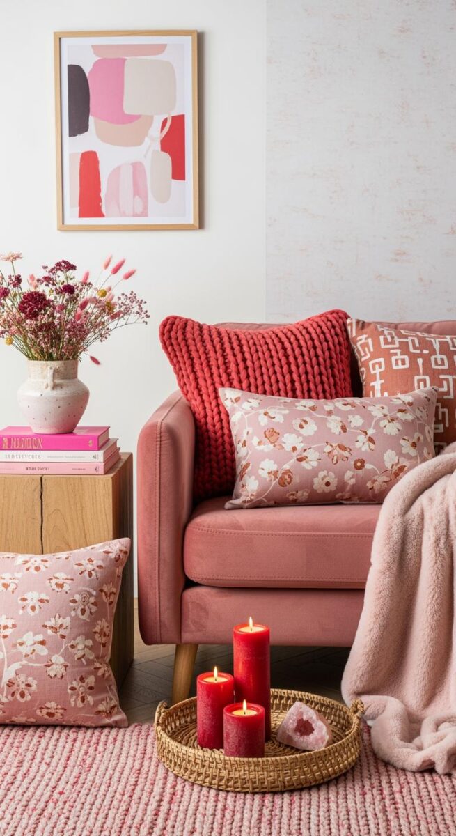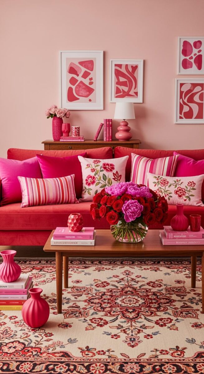 Pink and red work beautifully with natural elements like wood and greenery, and a wooden coffee table or woven baskets can ground the vibrant colors.