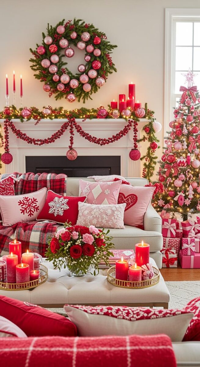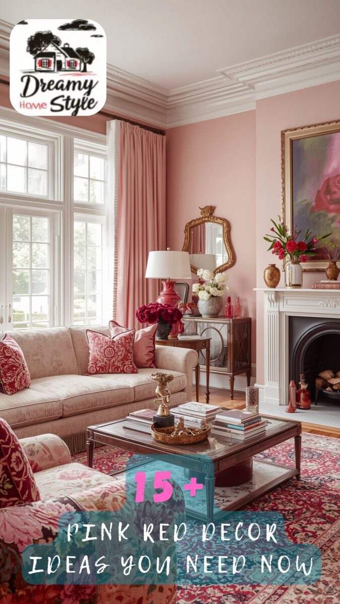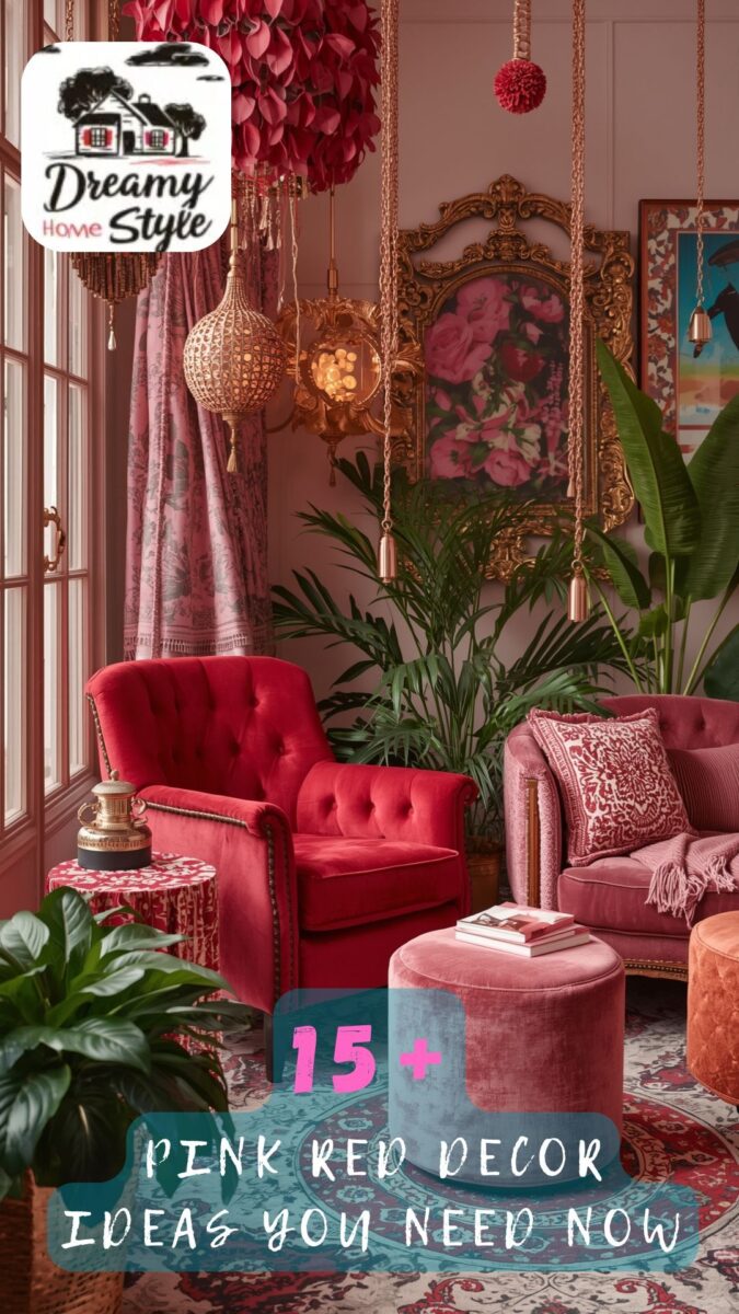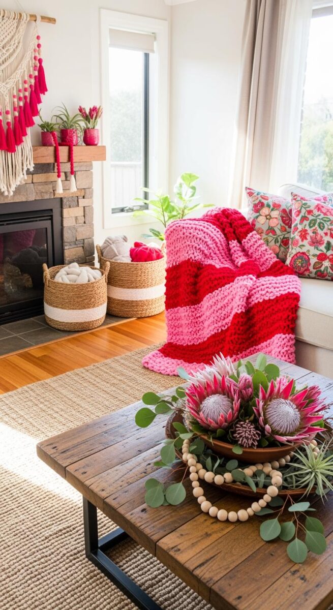 Pink and red work beautifully with natural elements like wood and greenery, and a wooden coffee table or woven baskets can ground the vibrant colors.