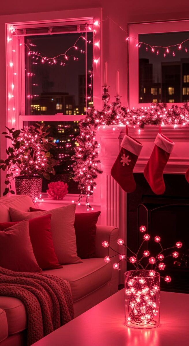 Soft, warm lights complement pink and red tones, and string fairy lights or candles can make the colors pop and create a romantic vibe.