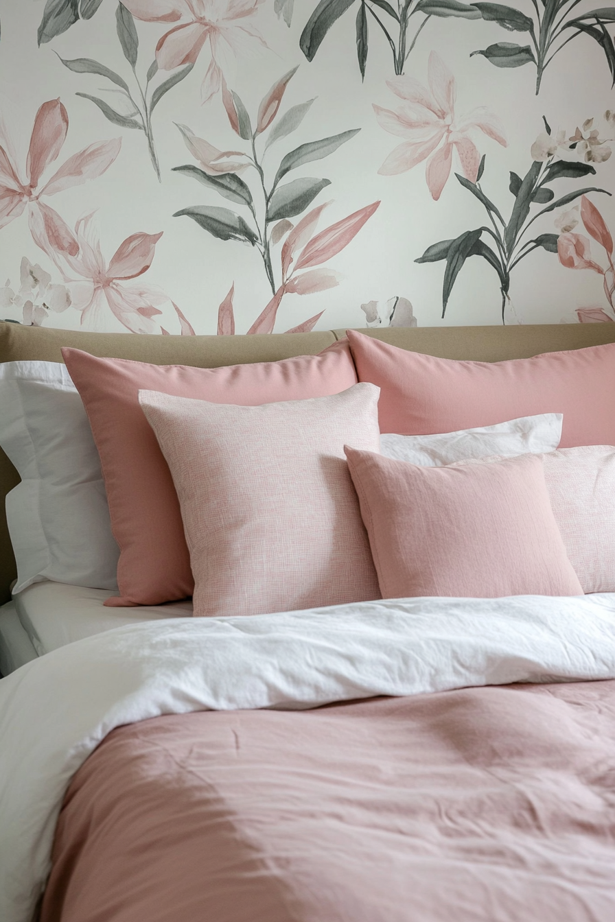For a bedroom, blush botanical wallpaper is ideal behind the bed or on the feature wall.