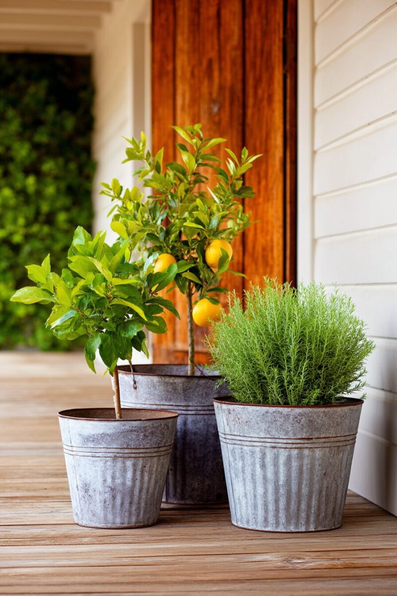 The reflective quality of metal buckets actually helps bounce light onto your plants, potentially boosting growth while also adding a subtle sparkle to your porch display.