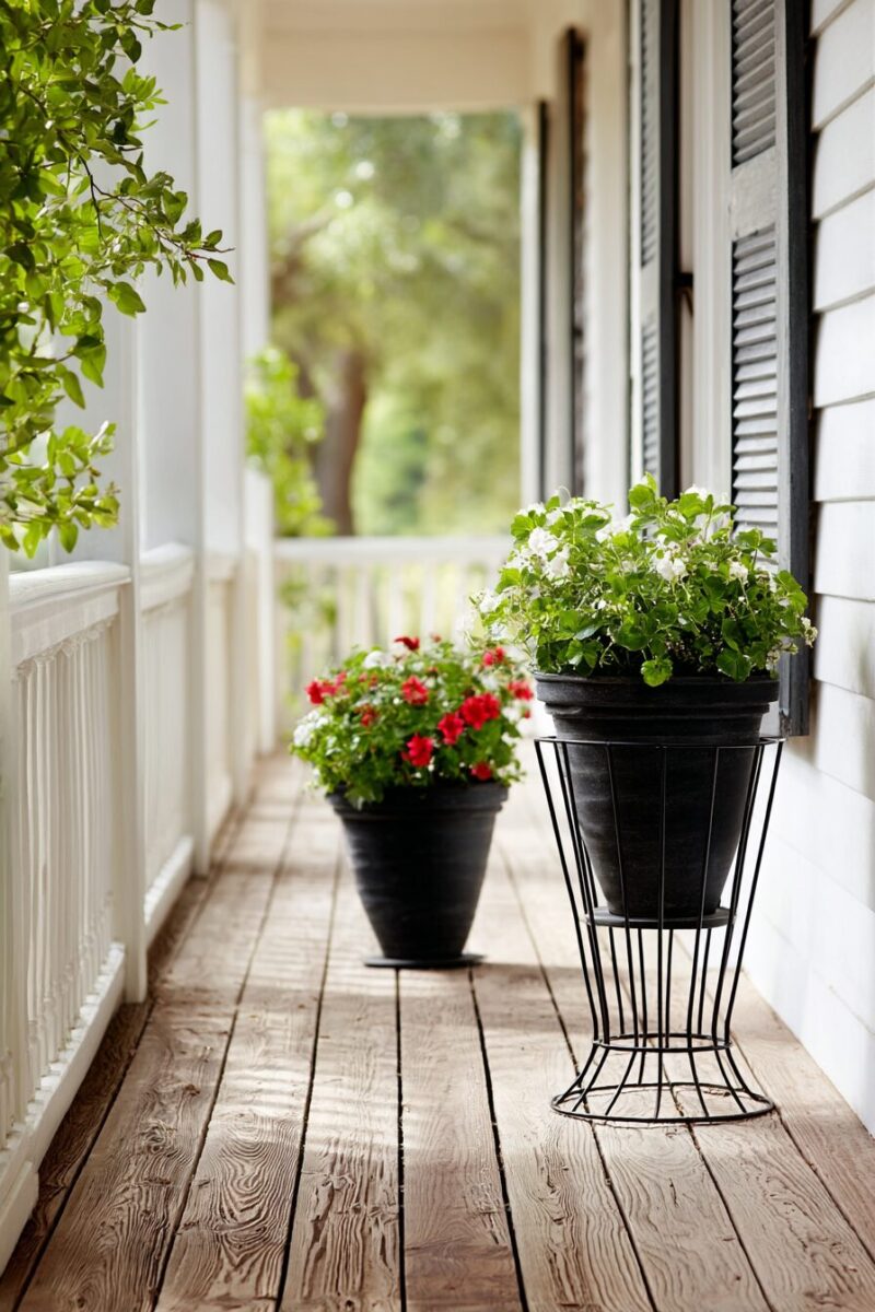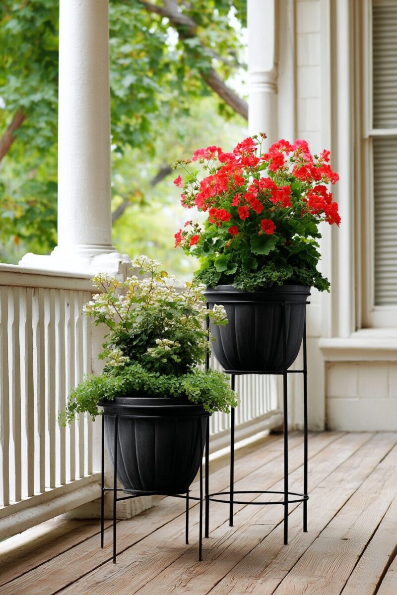 The elevated display created by tiered iron stands naturally draws the eye upward, making your porch feel more spacious while showcasing plants at varying heights for maximum visual impact.