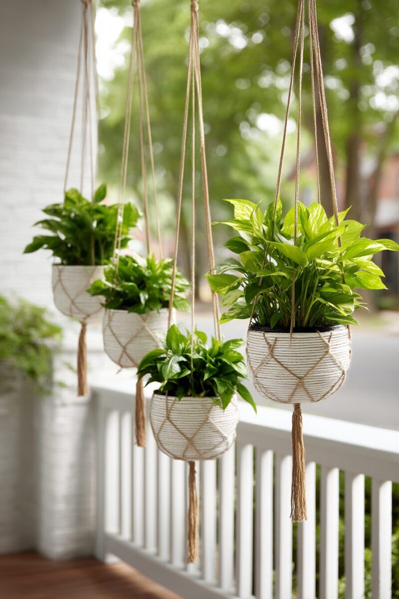 For maximum impact, consider hanging several macramé planters at slightly varied heights, creating a cascading effect that draws the eye upward and makes your porch ceiling part of the overall design.