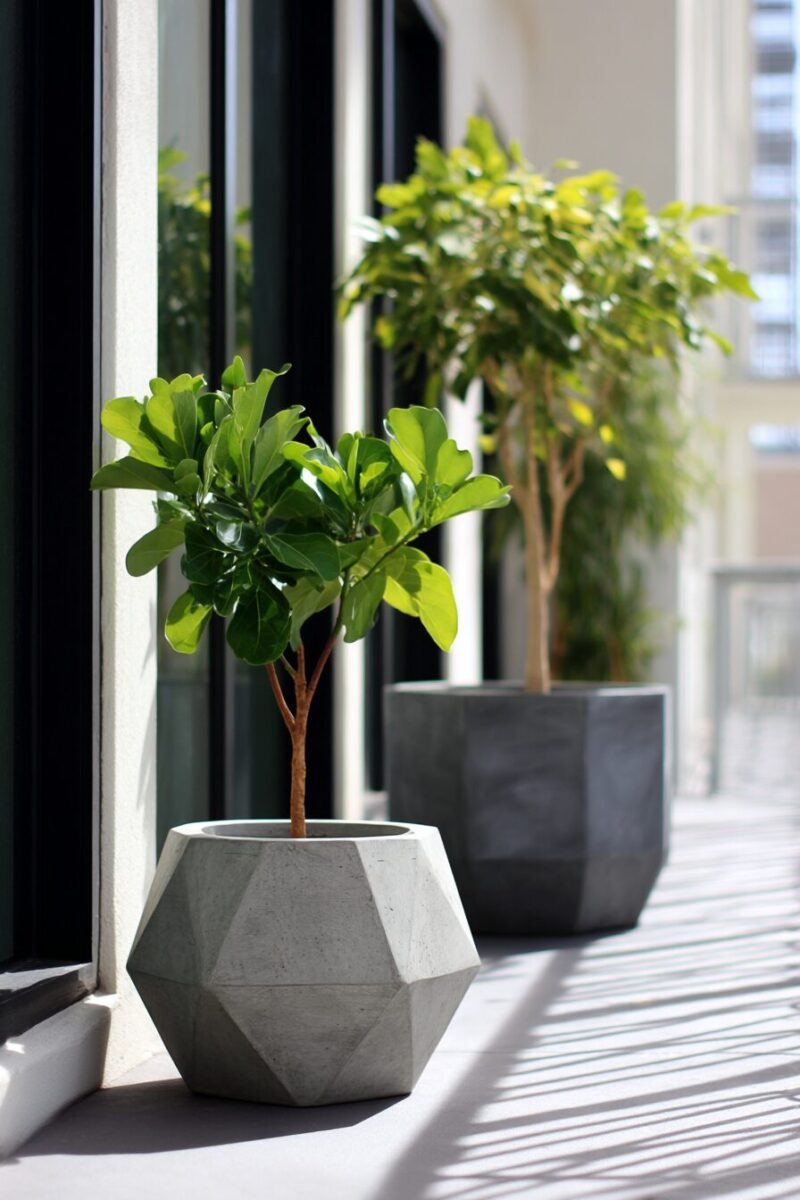 Succulents and architectural plants like snake plants, agave, or ornamental grasses particularly shine in geometric planters, their structural forms echoing and enhancing the containers’ modern aesthetic.