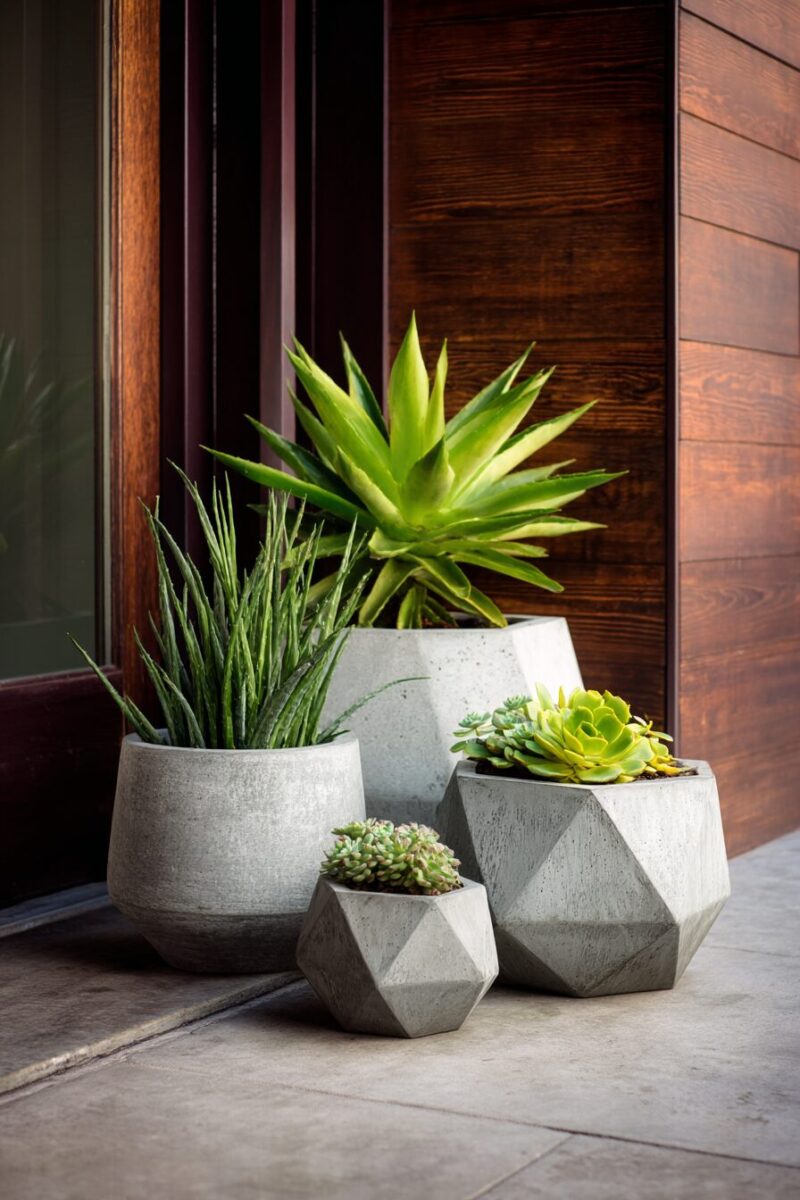 Clean lines and architectural shapes define concrete geometric planters, instantly adding contemporary sophistication to any front porch or entryway.