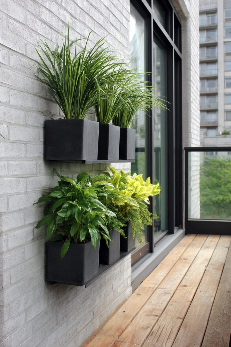 For smaller porches, wall-mounted geometric concrete planters make efficient use of vertical space while still delivering maximum style impact.