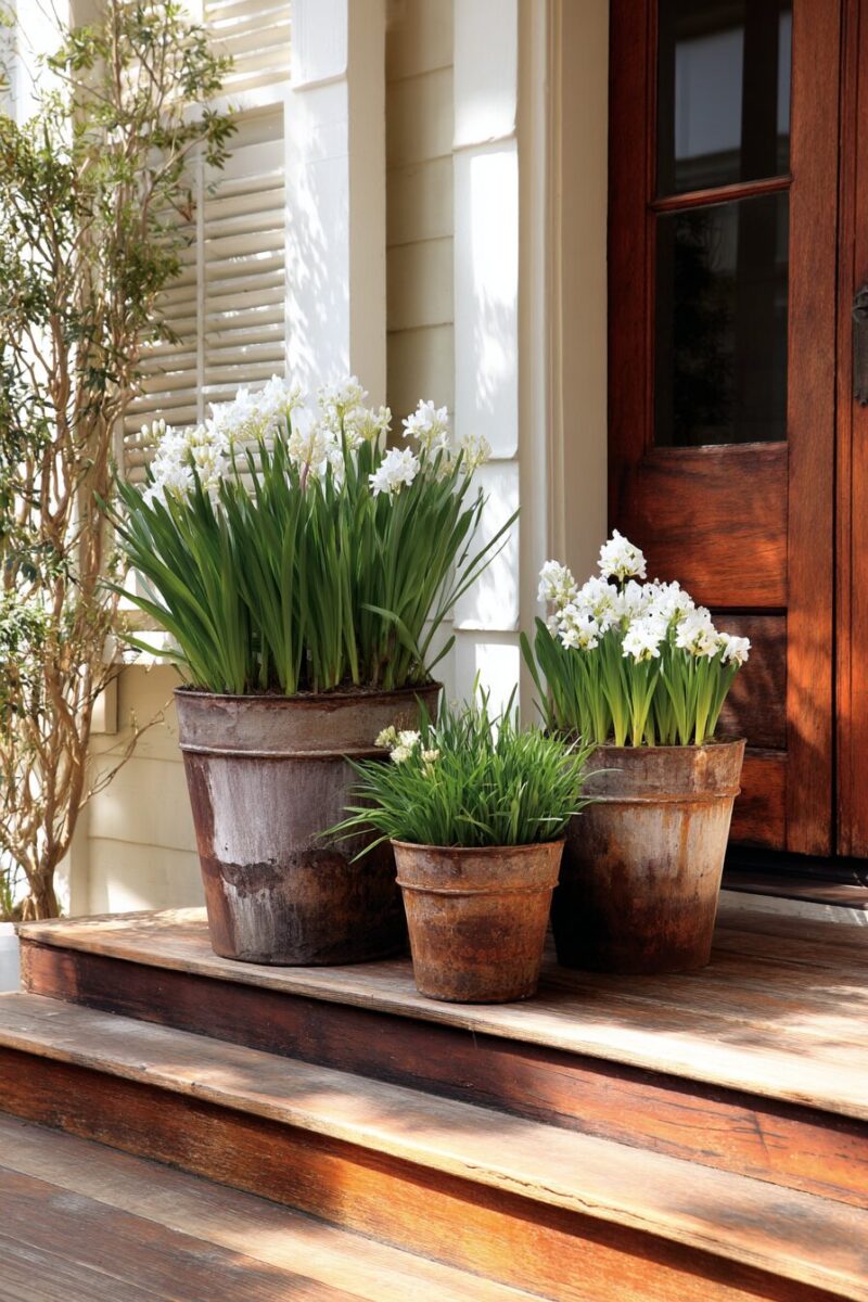 Unlike matching store-bought planters, antique containers bring natural variation in height, width, and form, creating more dynamic and visually interesting porch arrangements without additional styling effort.
