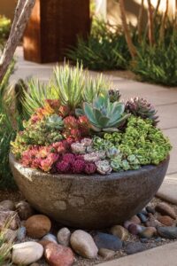 If plain gray seems too austere, look for concrete planters with colorful geometric patterns, or try your hand at personalizing them with weather-resistant paint in hues that complement your home’s exterior.