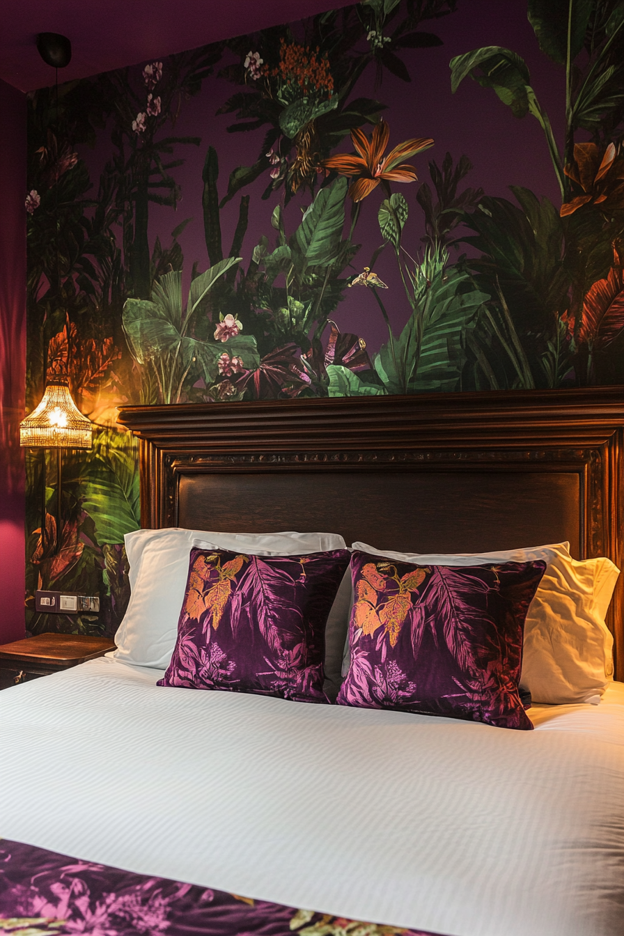 This botanical bedroom scheme pairs vibrant plum walls with lots of live plants and organic materials for an indoor jungle oasis.