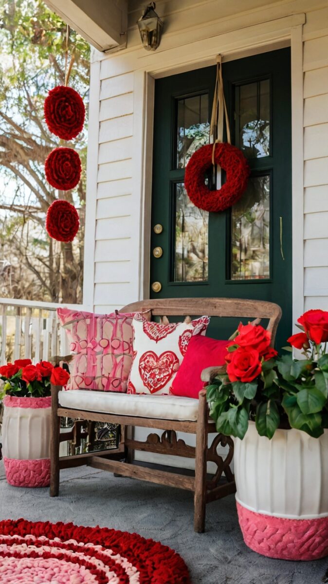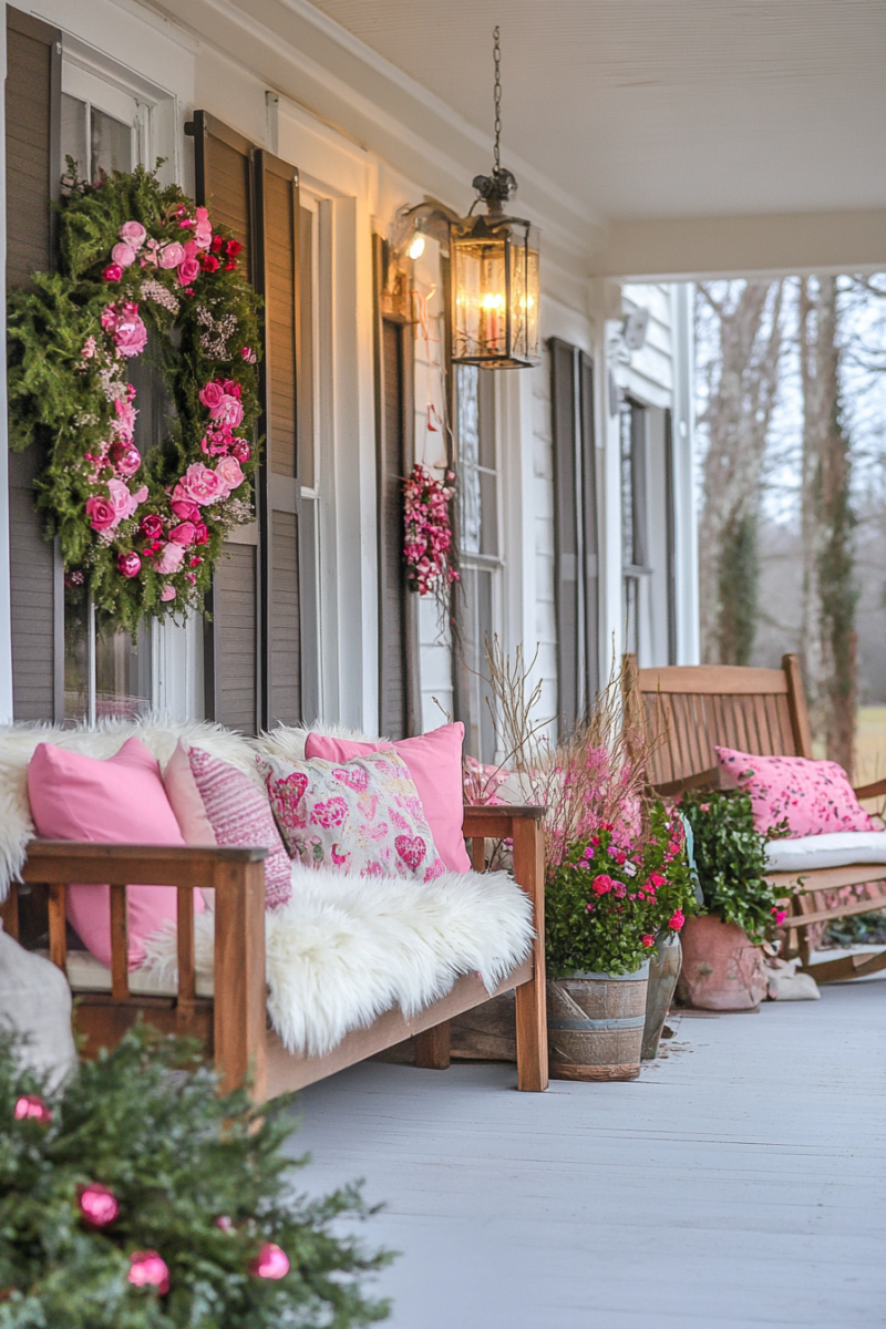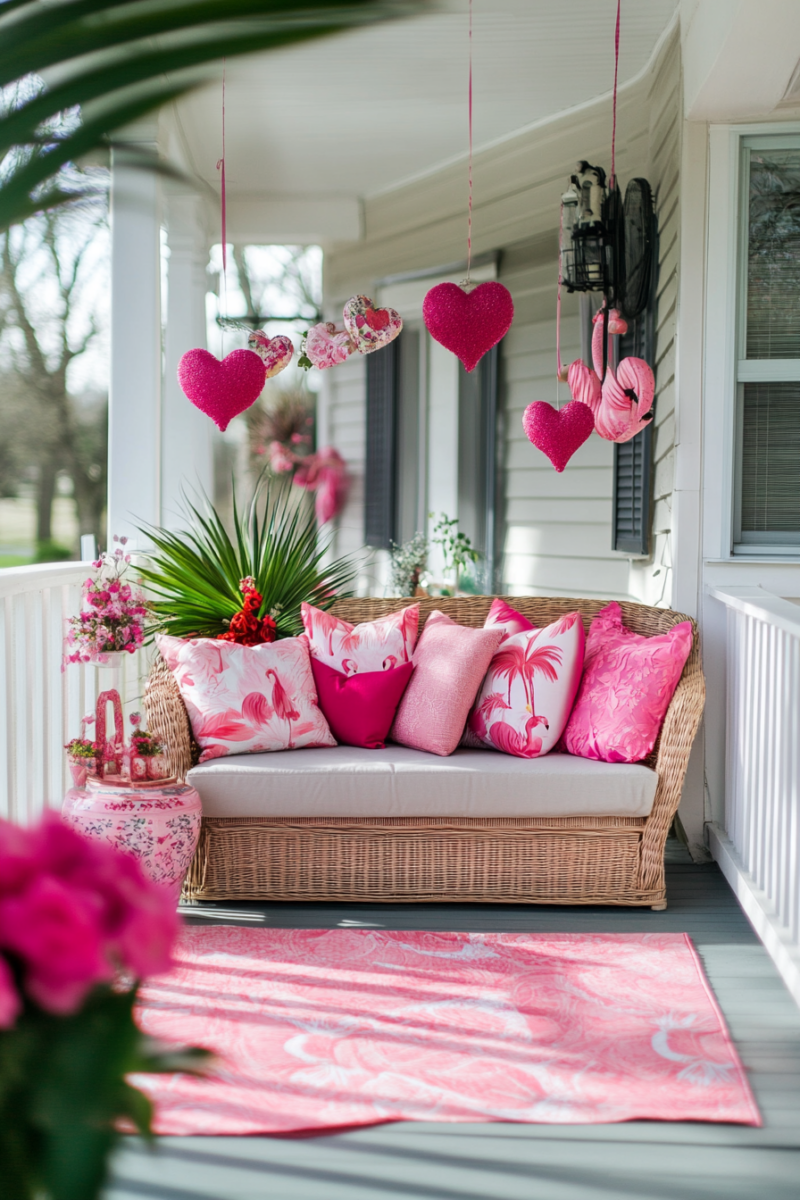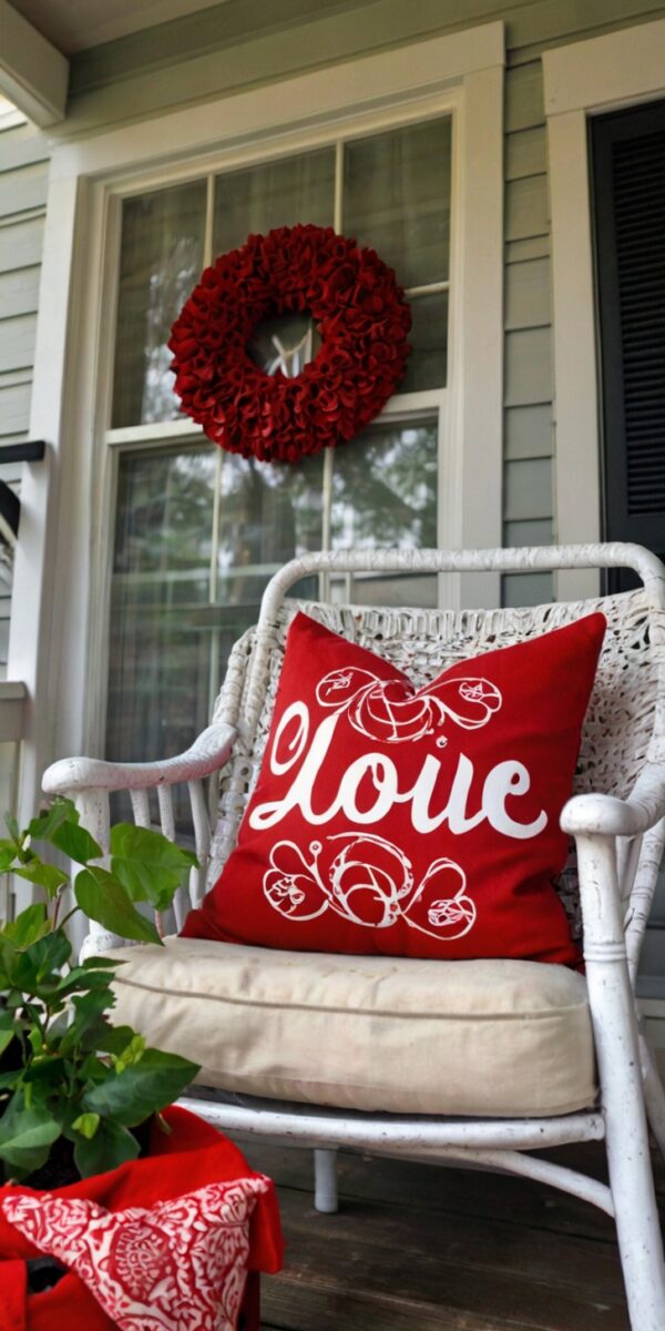 A cute Valentine’s pillow on porch seating is super festive.