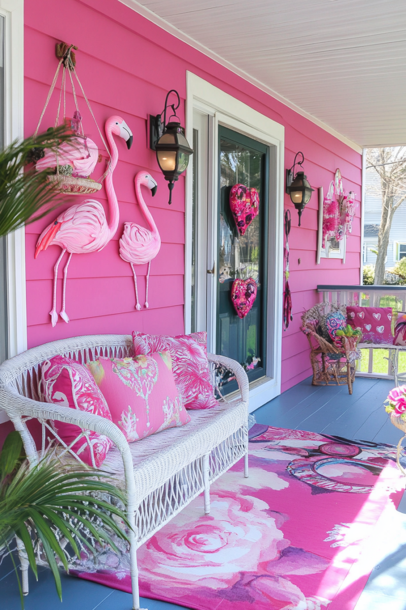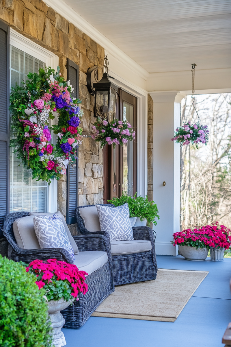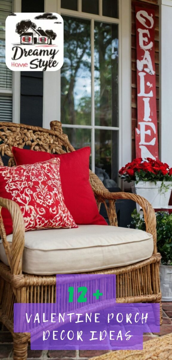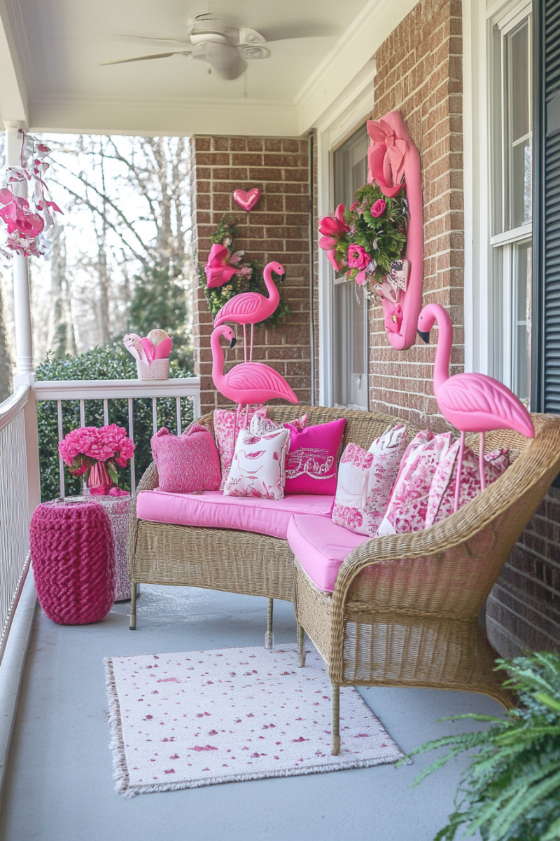 A cute Valentine’s pillow on porch seating is super festive.