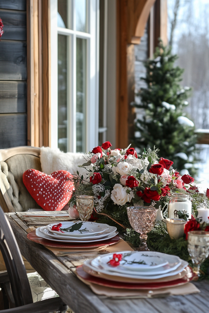 Incorporate flowers, candles, and greenery, opting for white blooms with pink or red tinted edges and accents.