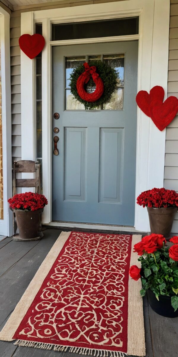 I layer a neutral jute rug underneath a cute Valentine’s doormat.