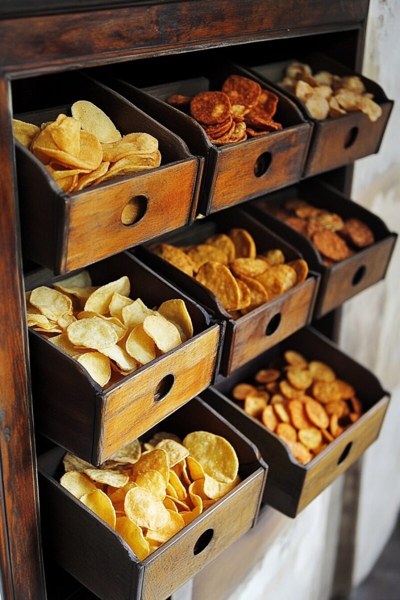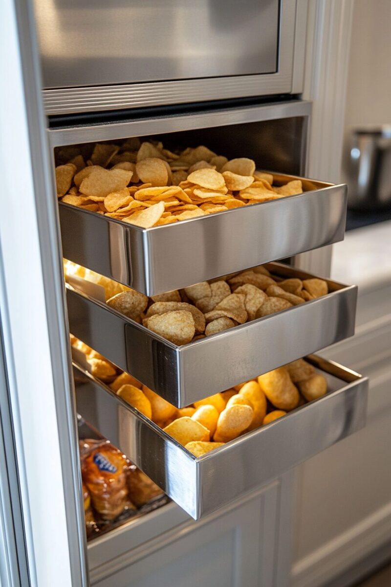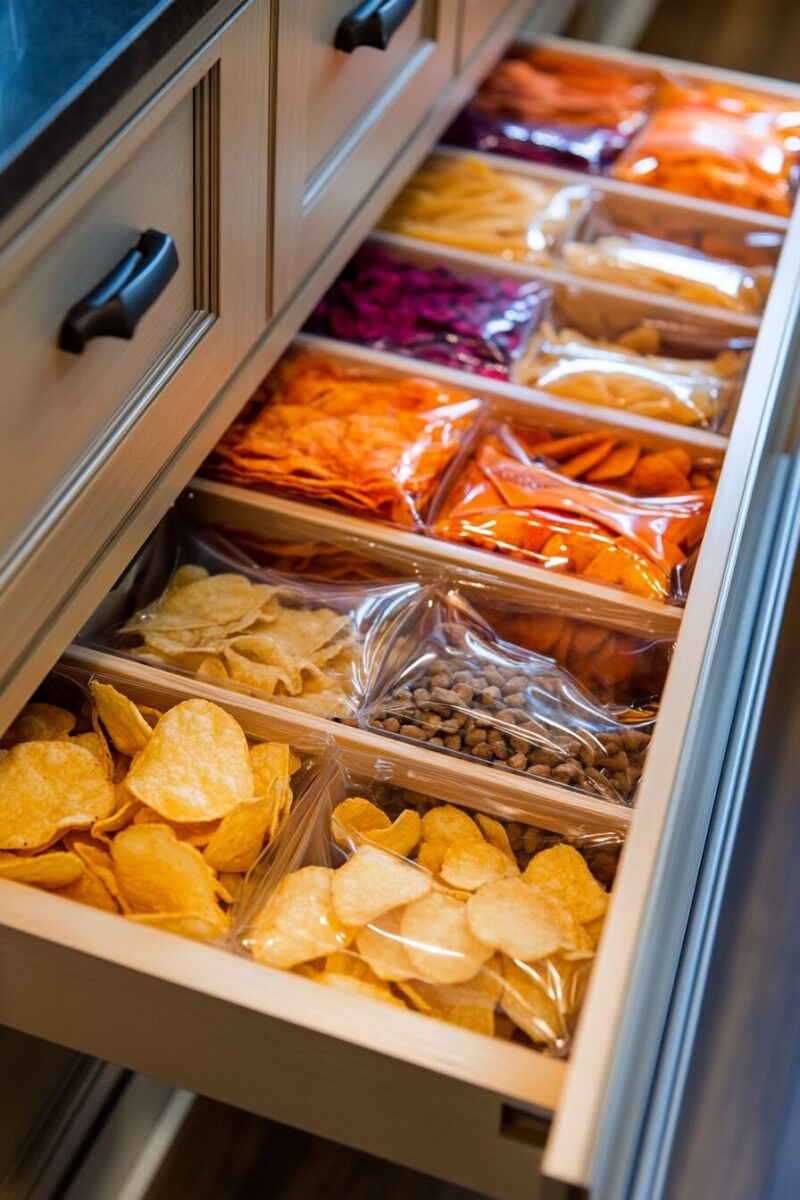 Dedicated chip drawers can be organized by flavor intensity, size, or even health factor for more mindful snacking choices.