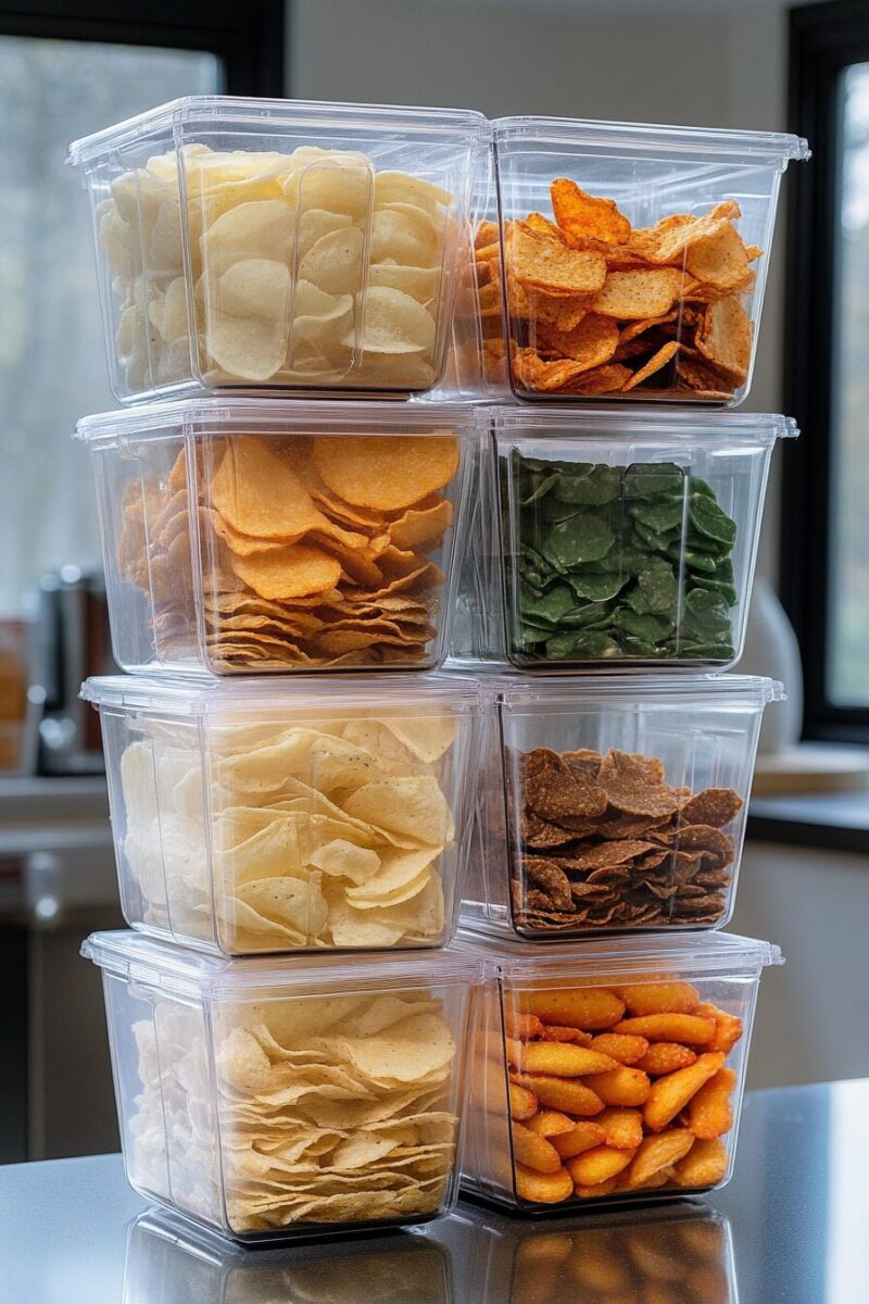 Try categorizing by chip type – ridged chips in one container, thin chips in another, flavored varieties in a third.