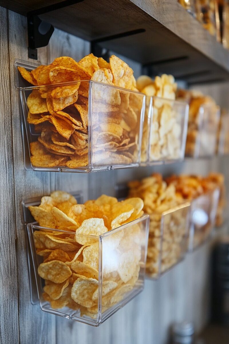The visual organization means you can instantly see every chip variety you own without digging through crowded shelves.