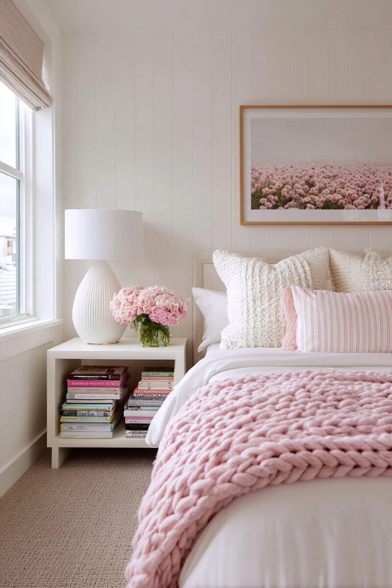 You can incorporate pink through accent pillows, artwork, or even a beautiful pink throw blanket.