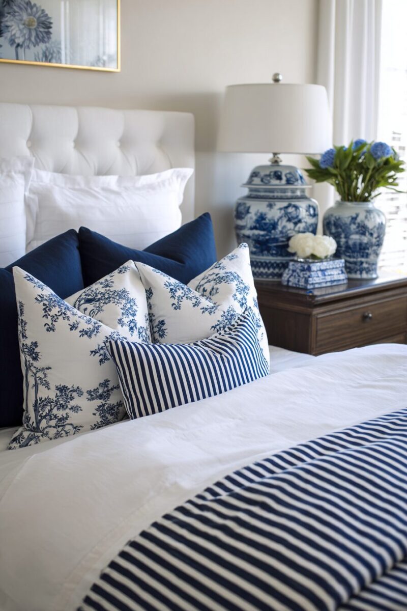 Layer different stripe widths throughout your bedding collection by incorporating striped pillowcases alongside solid navy or white sheets.