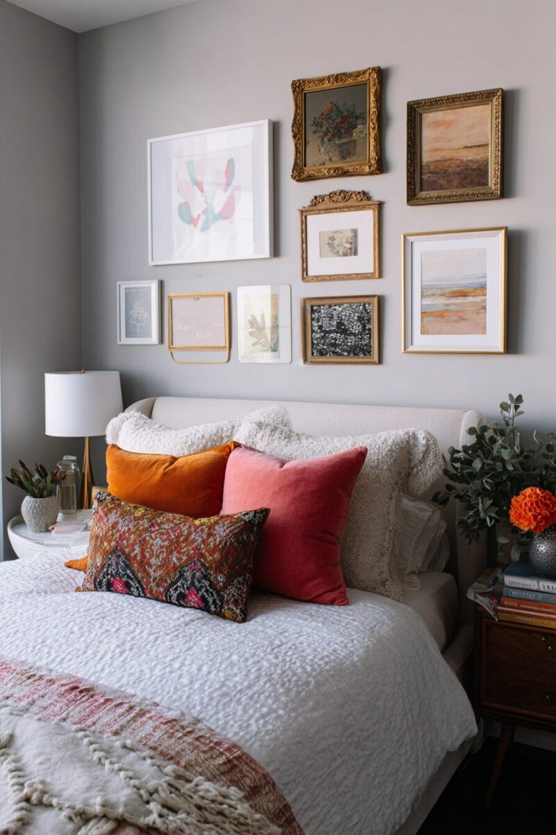 The placement of your gallery wall is crucial – position it where it can be easily seen and appreciated, such as above your headboard or on the wall opposite your bed.