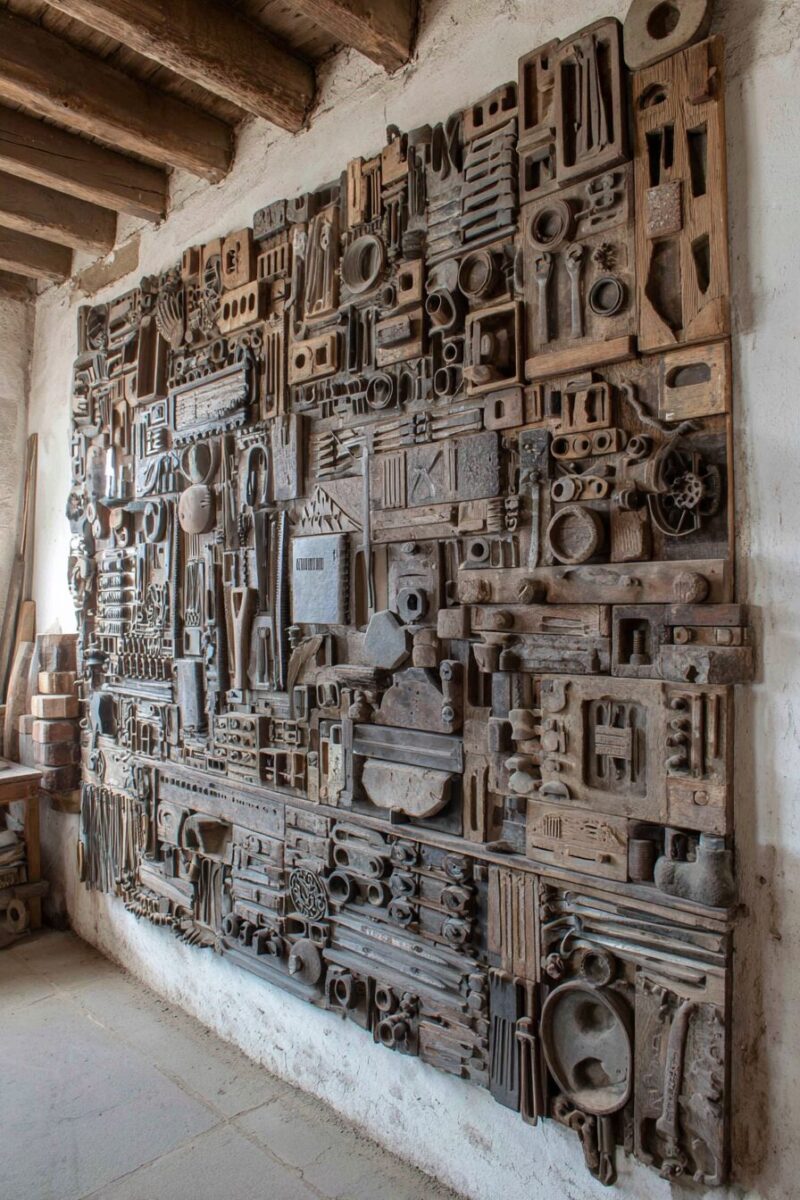 You’ll create fascinating focal points by mounting vintage tools and farm implements as functional wall art.
