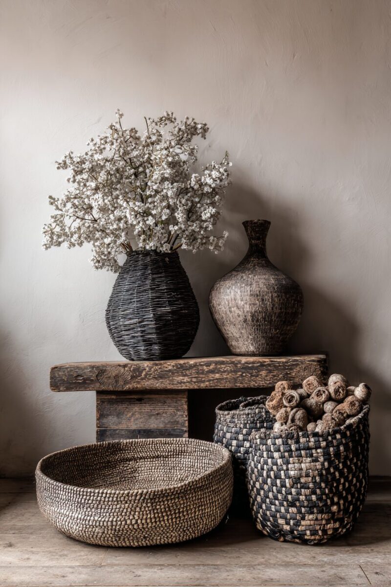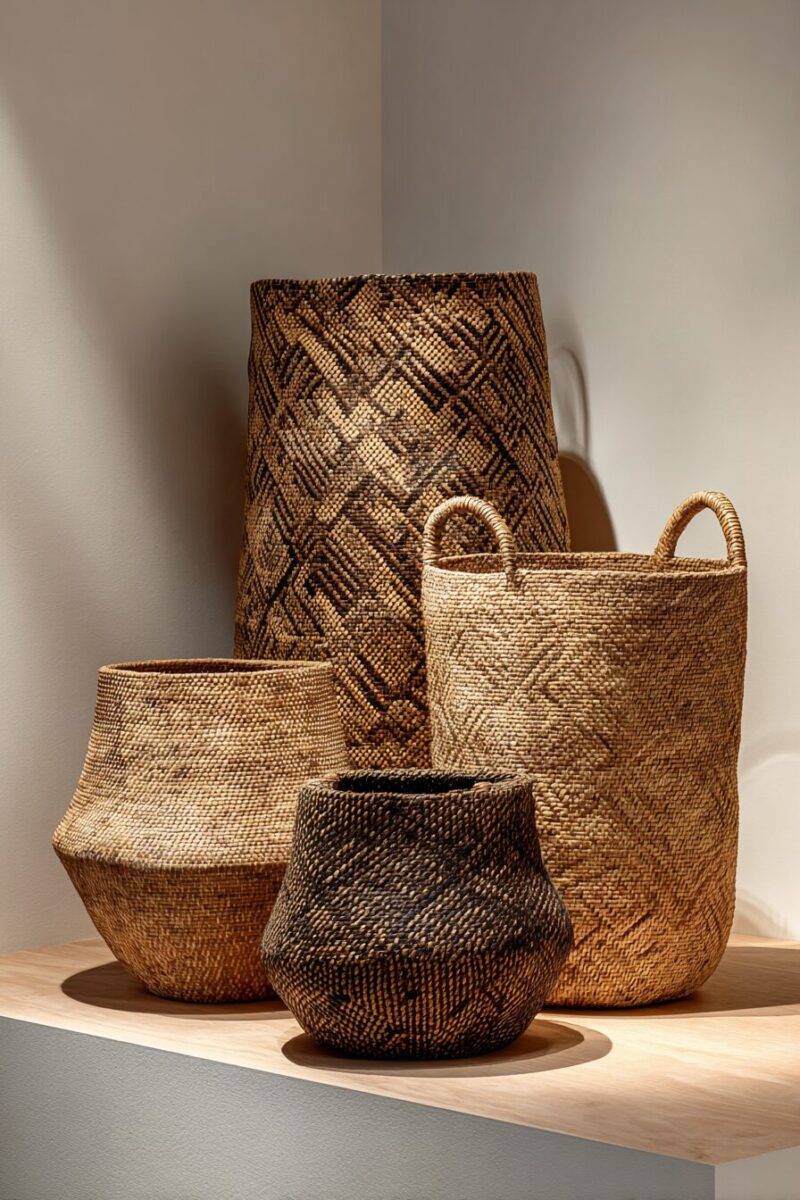 Mix different weaving patterns, sizes, and natural materials like rattan, seagrass, and jute for visual variety.