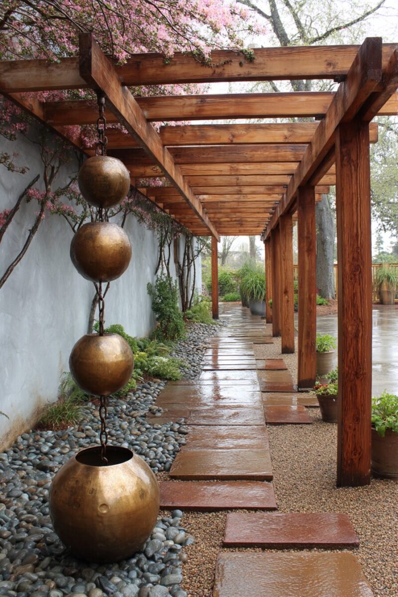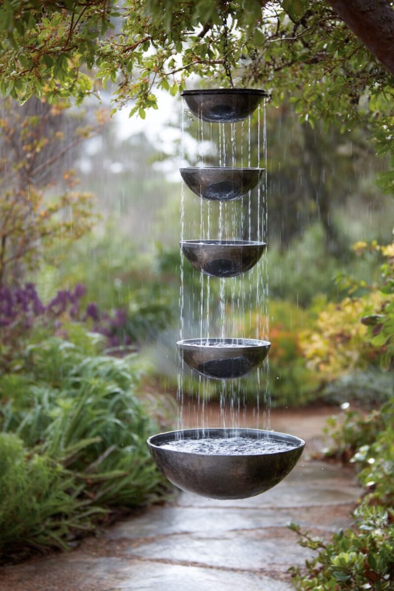 Rain chains replace traditional closed downspouts with decorative chains or cups that guide water visibly downward, creating a beautiful water feature during rainstorms.