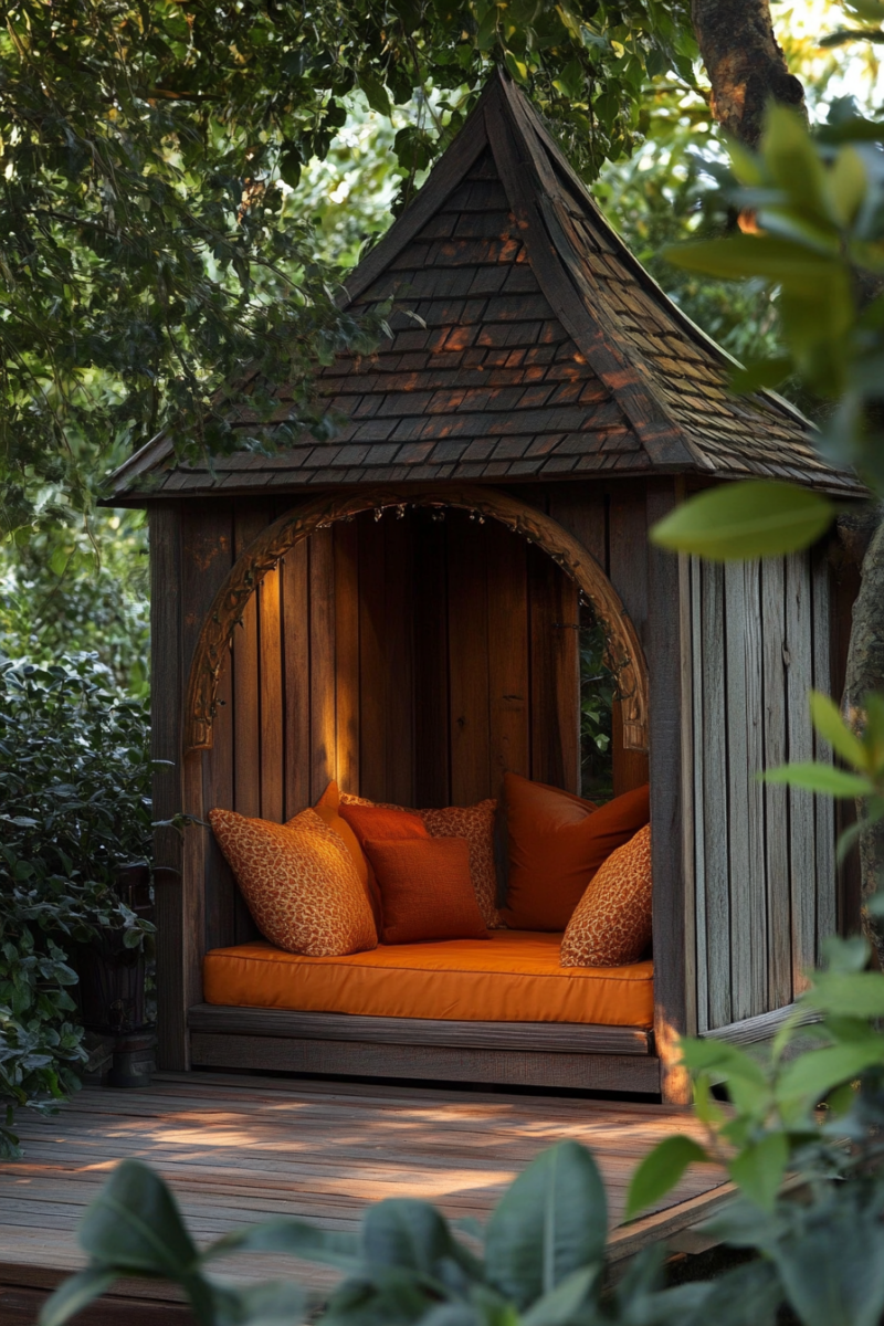 Style with a round pouf, curved daybed or hanging chair for a built-in curved shape.