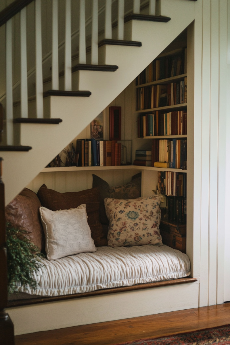 Naturally tucked-away spots like under the stairs can be transformed into delightful mini hideaways.