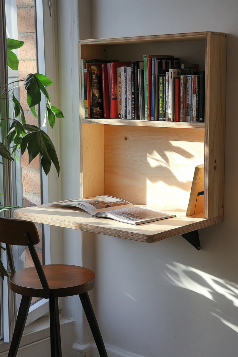Hang floating shelves to hold coffee table books, diaries or your journal for further creativity.