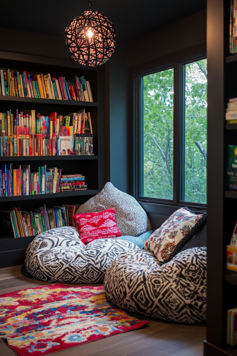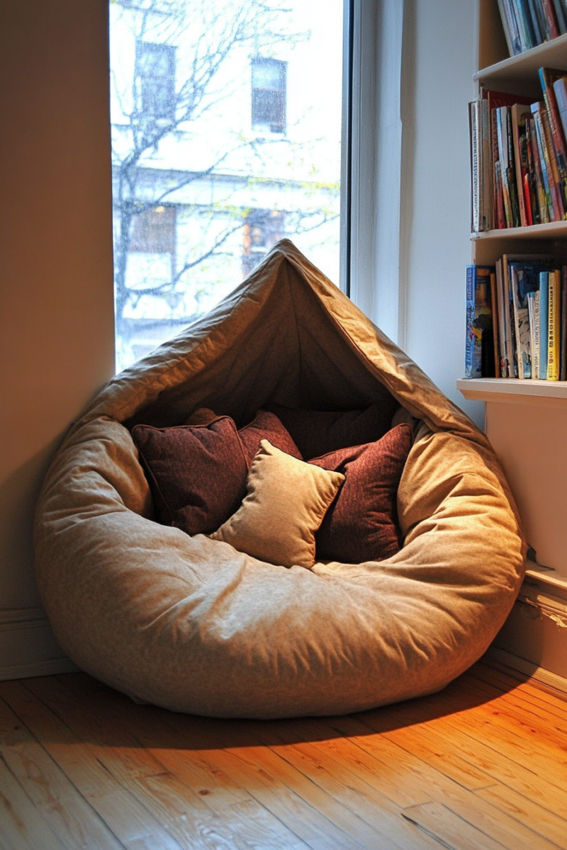 A plush bean bag chair offers the ultimate lounging spot to sink in with a good book.