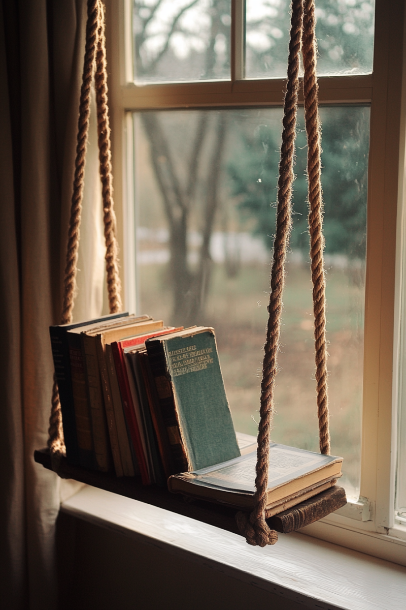 Look for a swing, hammock or circular hanging chair that will fit nicely within the window space when hung from the ceiling or frame above.