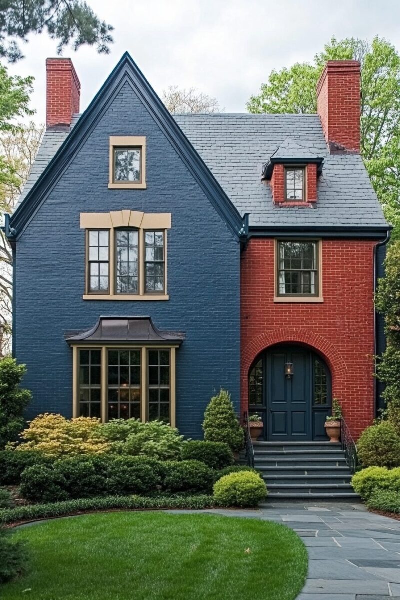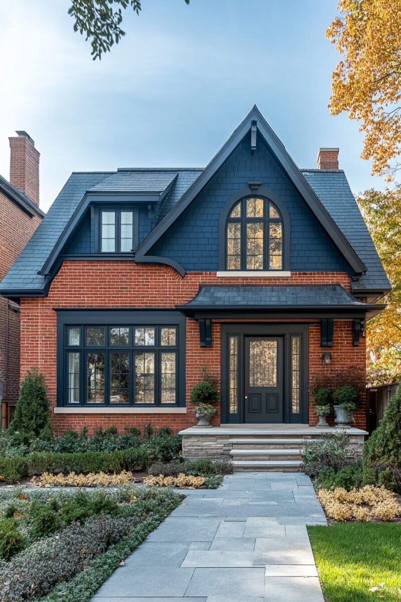 Using slate blue on shutters, doors, and architectural details adds a cool counterpoint to the warmth of the brick, creating balanced visual interest.