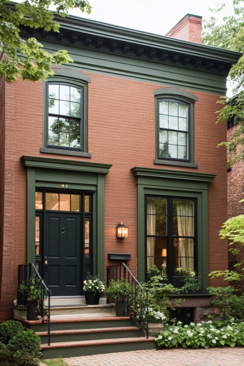 Using olive green on shutters, doors, or architectural details adds depth and dimension without overwhelming the natural beauty of the brick.