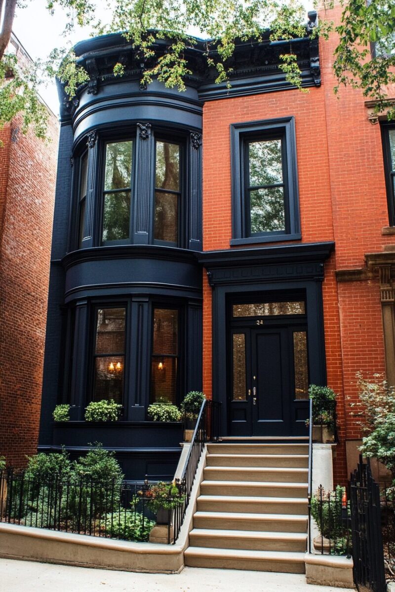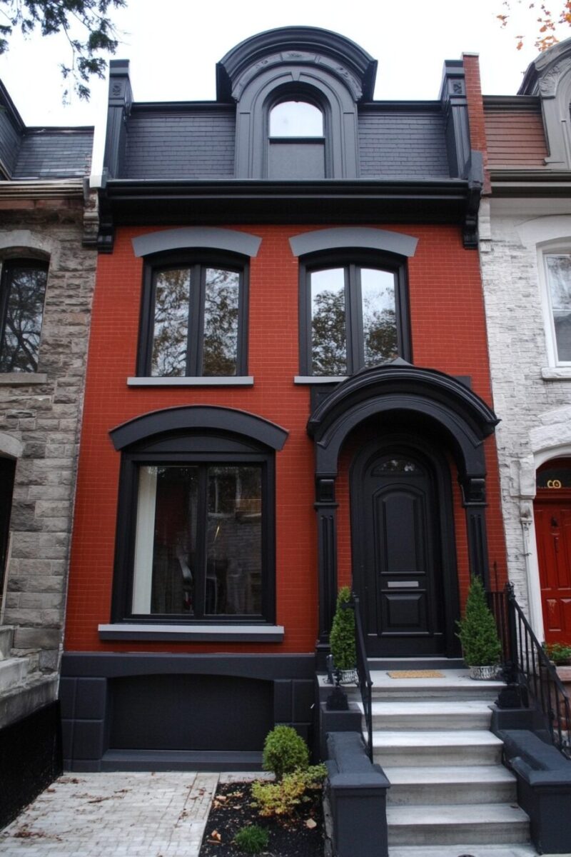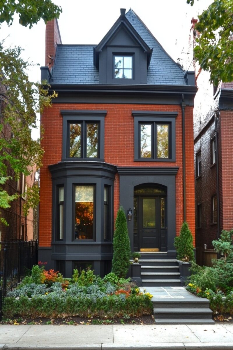 Charcoal gray creates dramatic contrast against red brick while maintaining a sophisticated, contemporary edge.