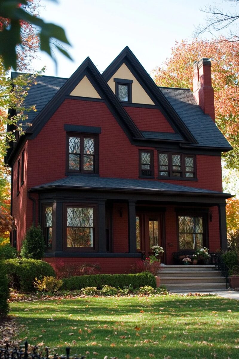 Using burgundy on shutters, doors, and architectural details adds depth and intensity while maintaining a cohesive overall appearance.