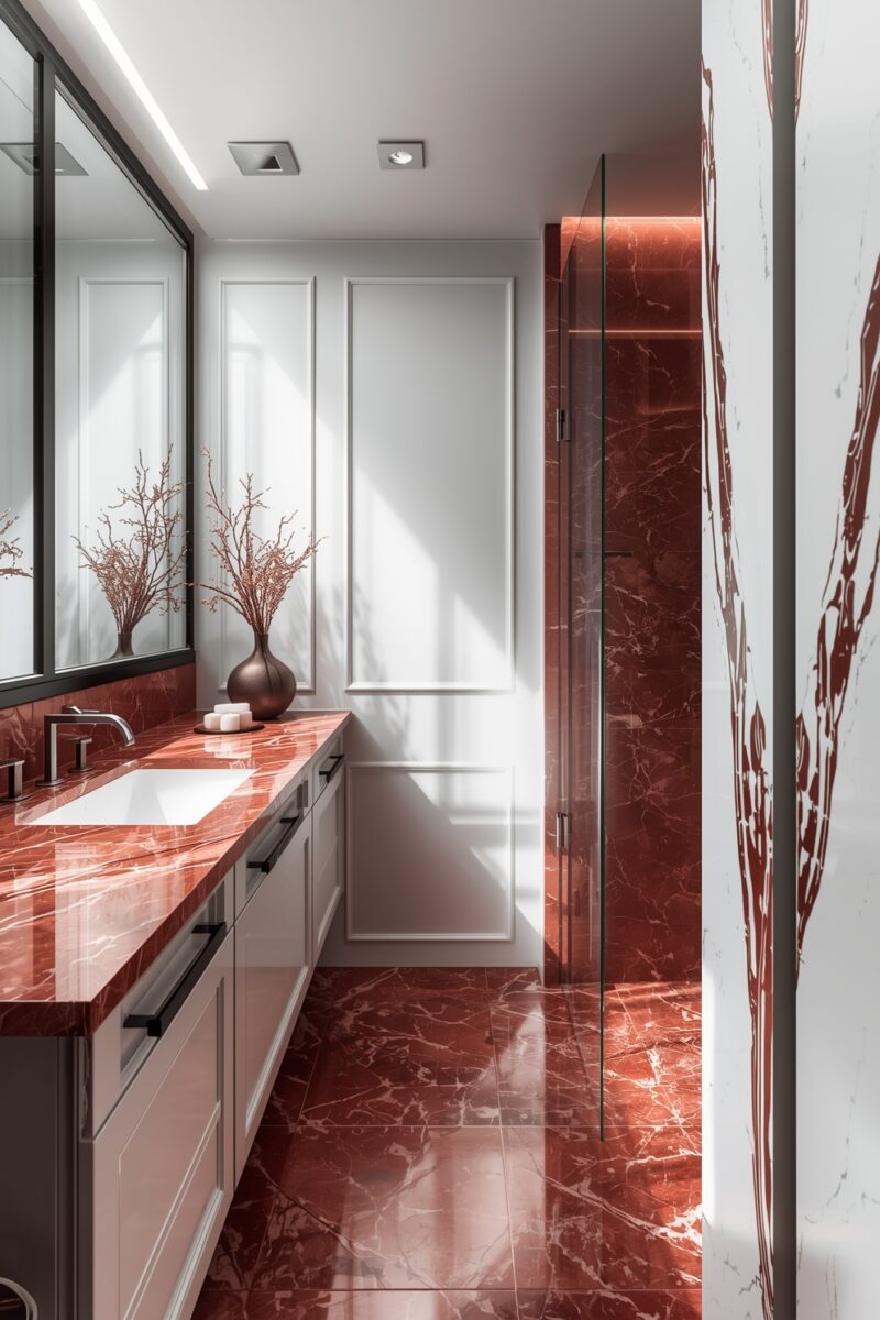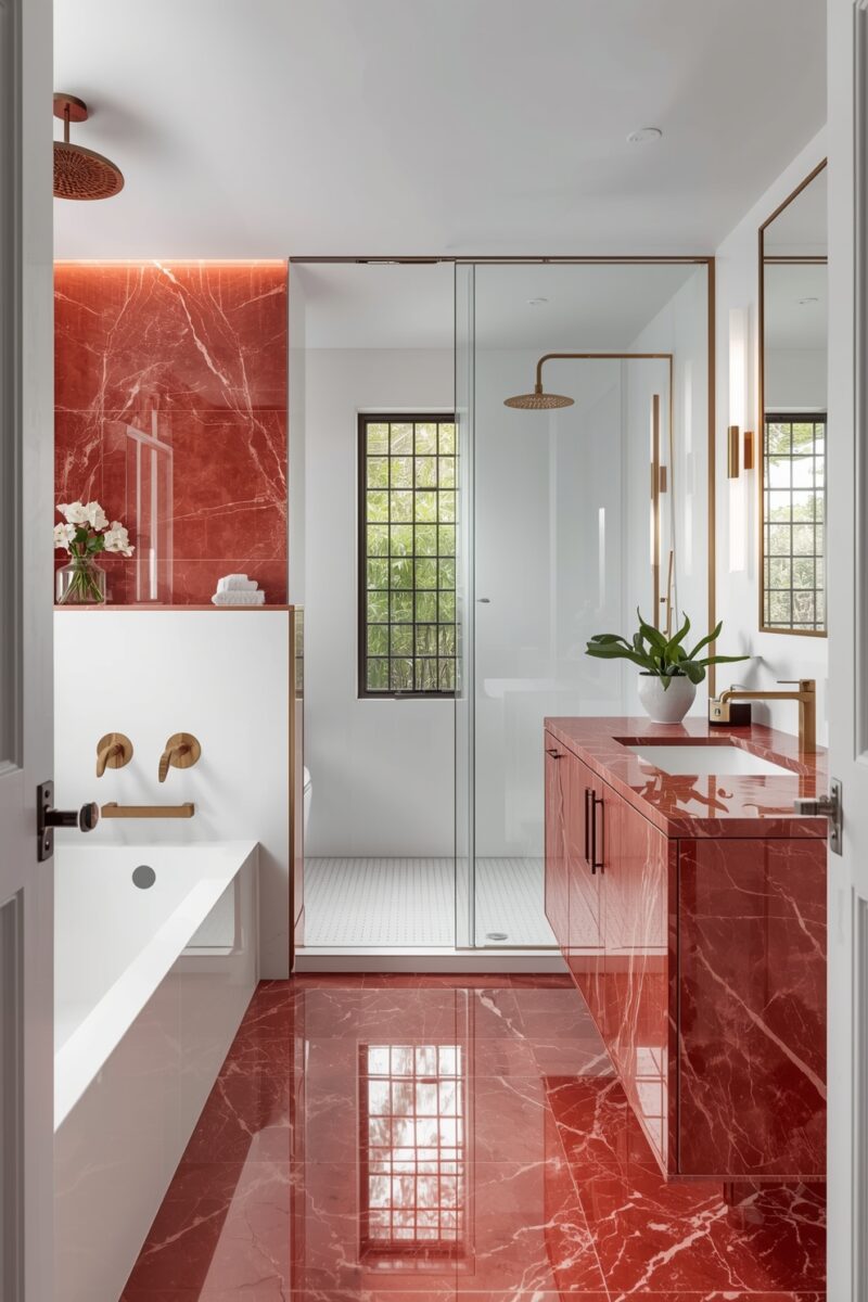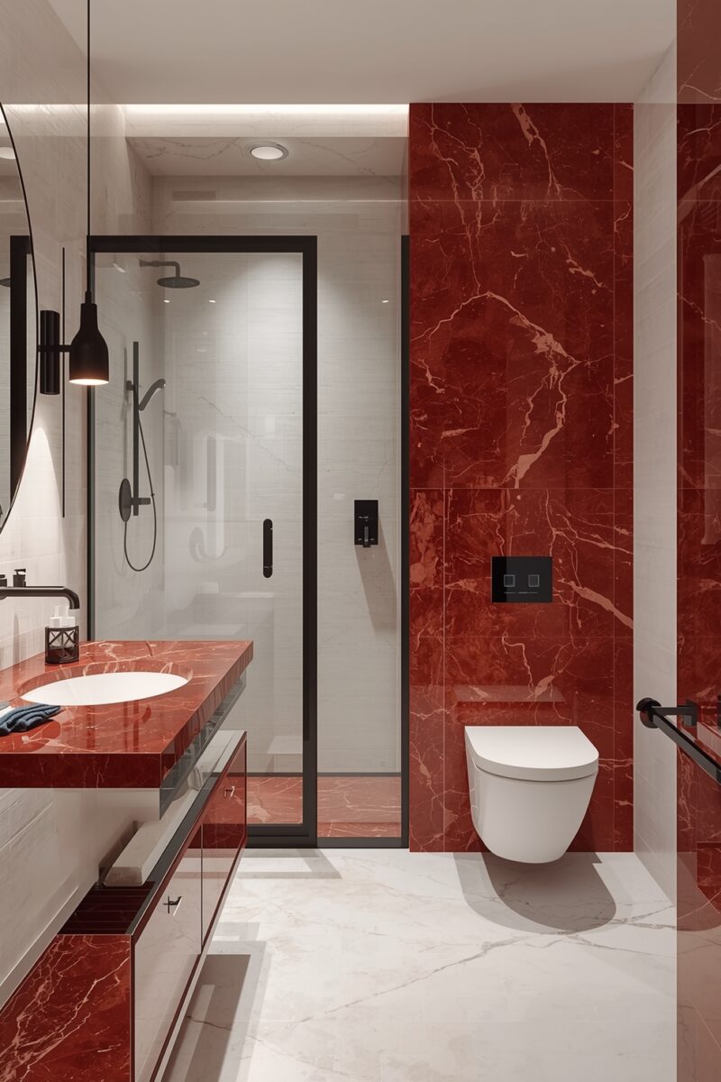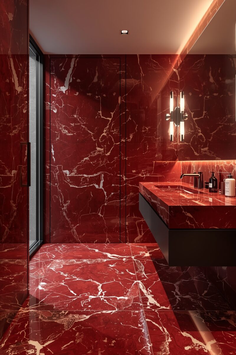 Red marble as the anchor (floor, vanity, or feature wall.)