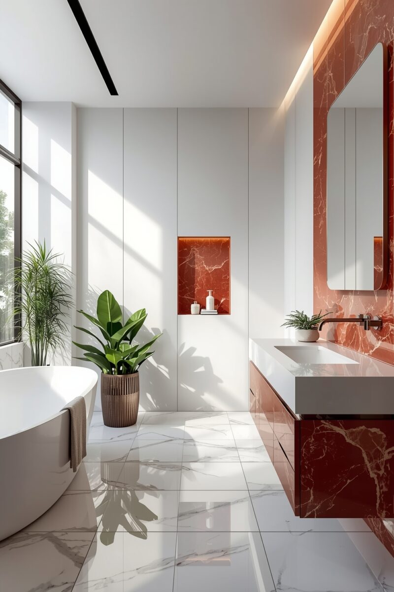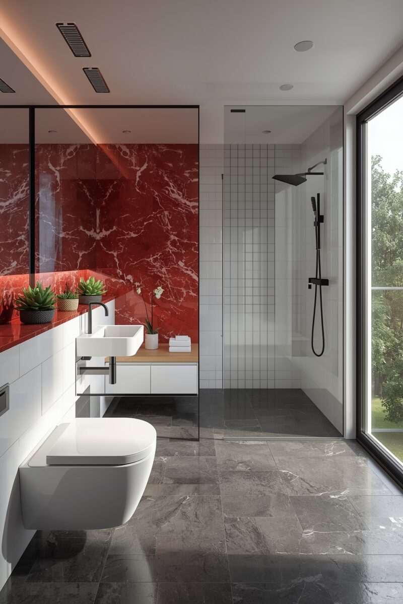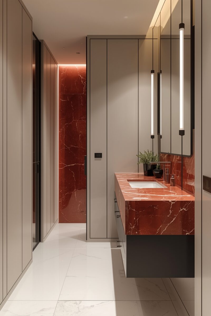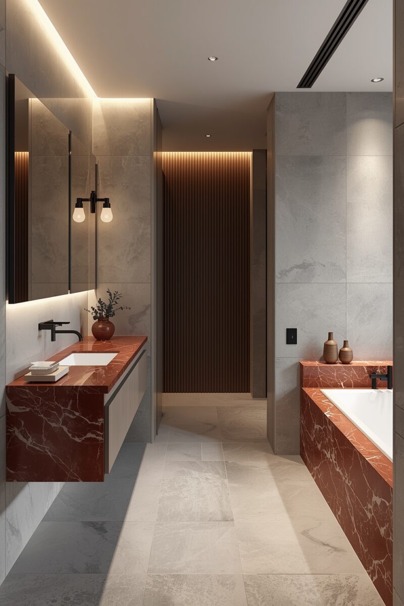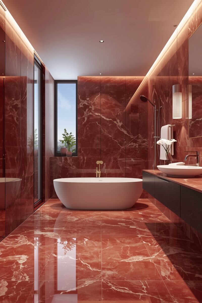 Red marble as the anchor (floor, vanity, or feature wall.)