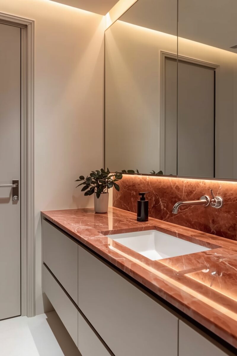 Warm lighting brings out the depth in the veining, makes the red tones glow, and gives the whole bathroom this candlelit, romantic quality that I genuinely cannot get enough of.