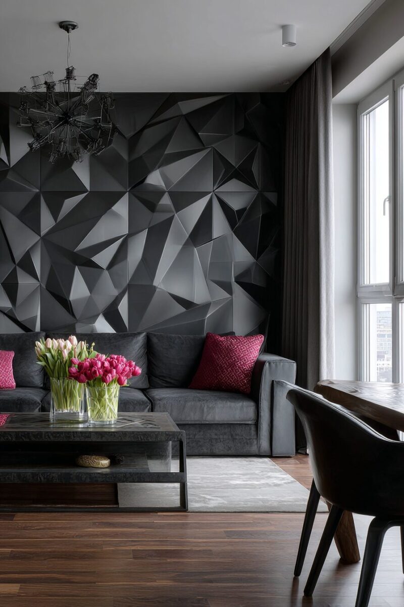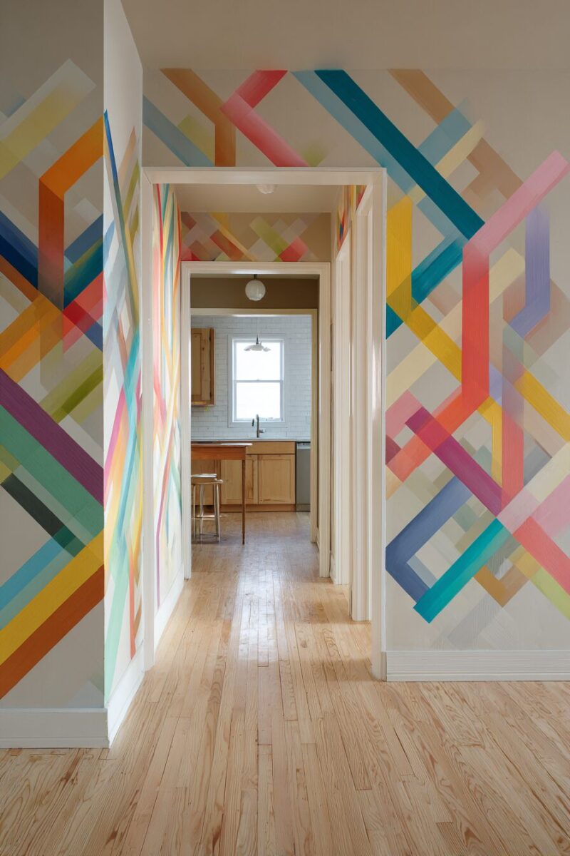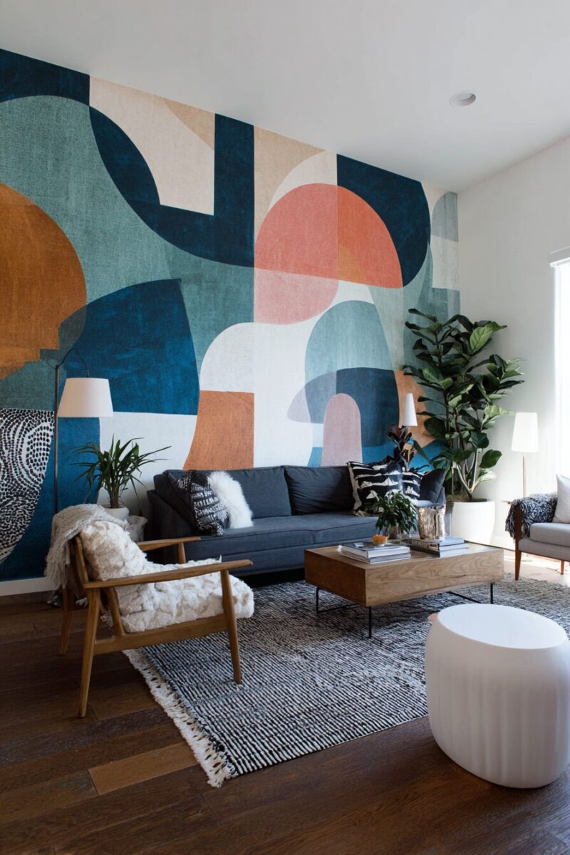 Geometric designs that spread across an entire wall create the illusion of custom painting or wallpaper while maintaining the temporary nature renters require.