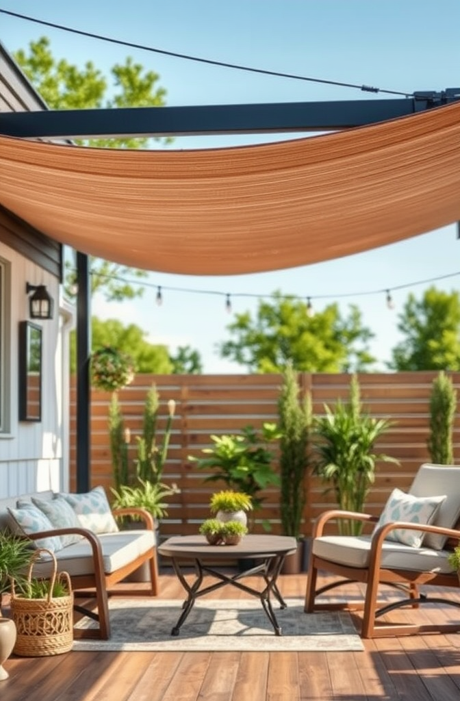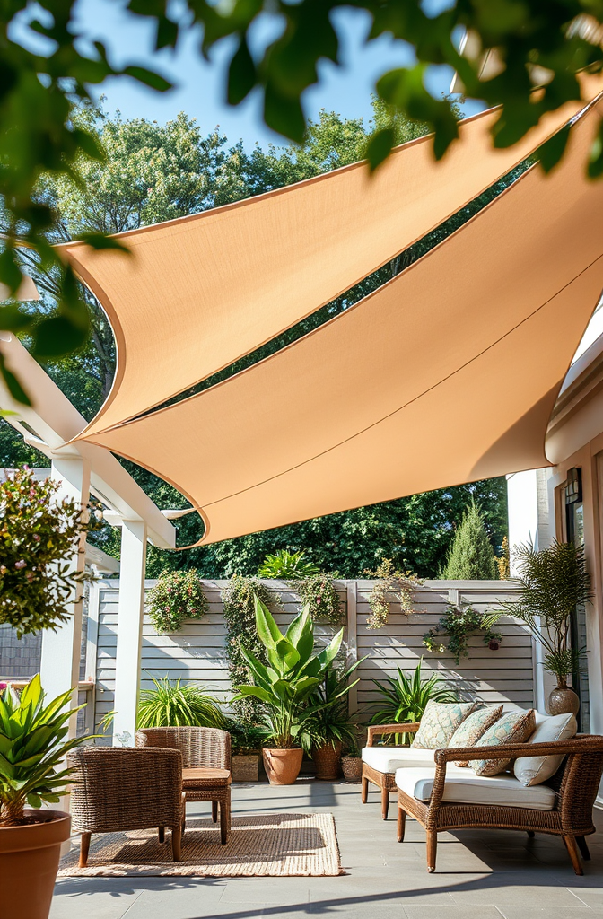 These triangular or rectangular fabric panels are tensioned between mounting points, creating three-dimensional shapes that seem to float above your outdoor area.