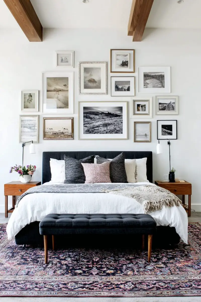 You create a gallery wall above the bed, over a sideboard, or along a corridor of the bedroom.
