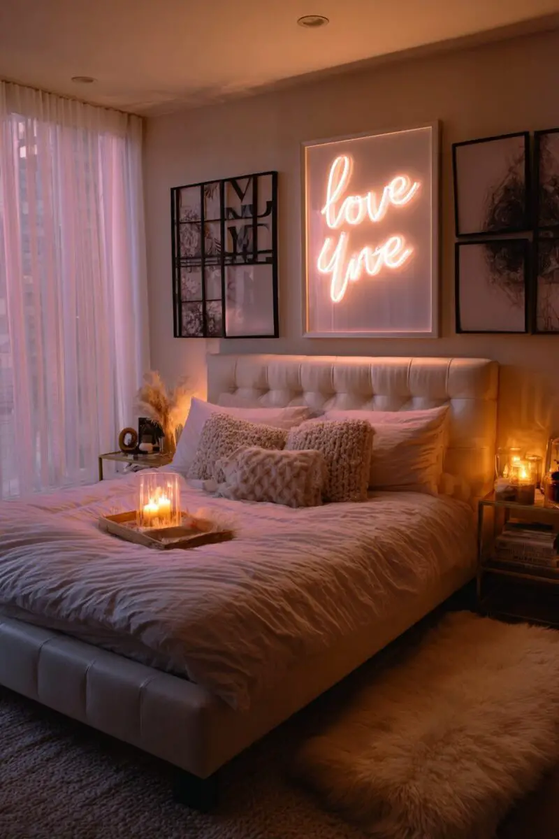 You might even hang a small framed photo or piece of art above the headboard that glows in the soft light—giving you a visual anchor that reminds you of your story.